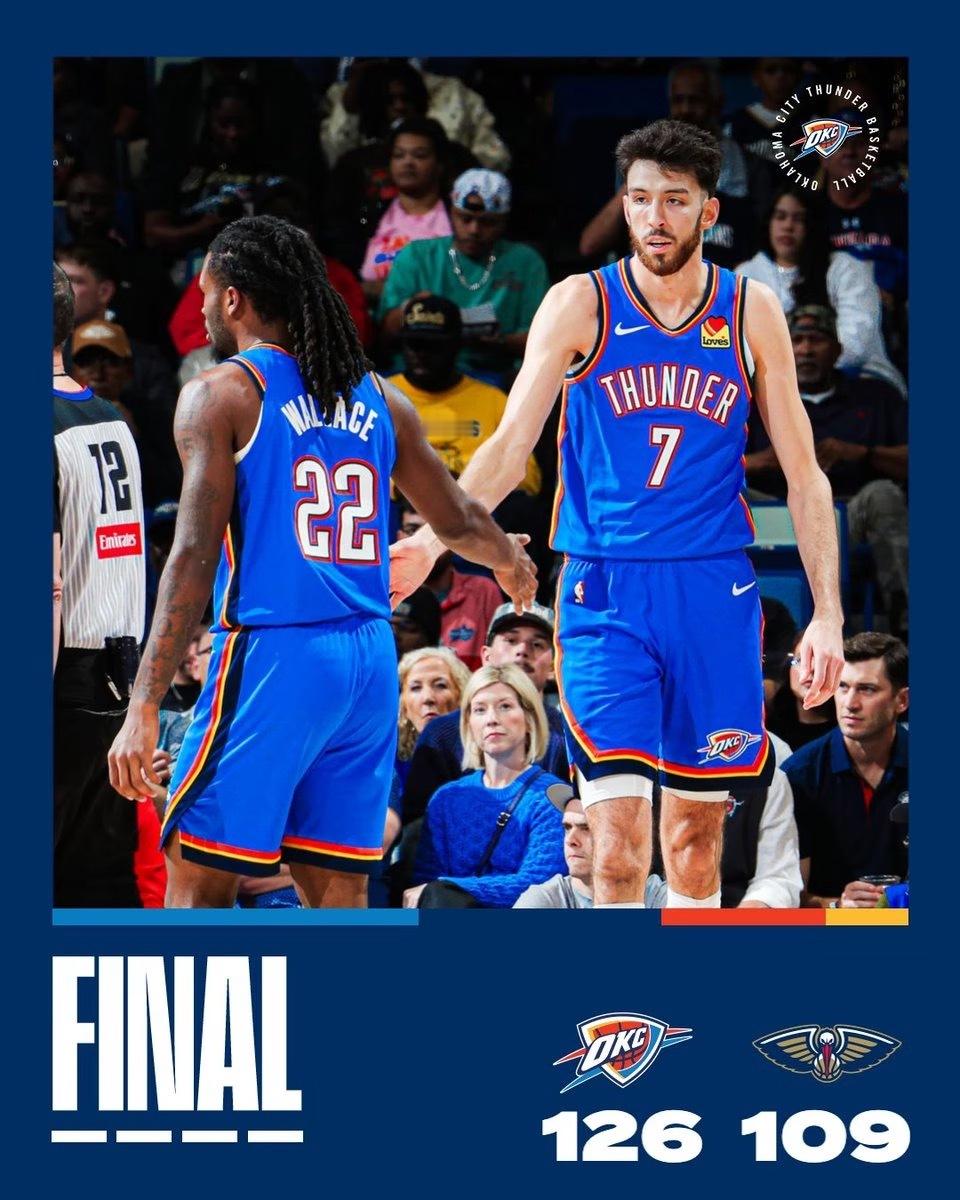 雷霆又一场大胜,全场领先,最多领先30分,首节49分创造队史纪录!雷霆目前赛季15战14胜,联盟第一,一骑绝尘!