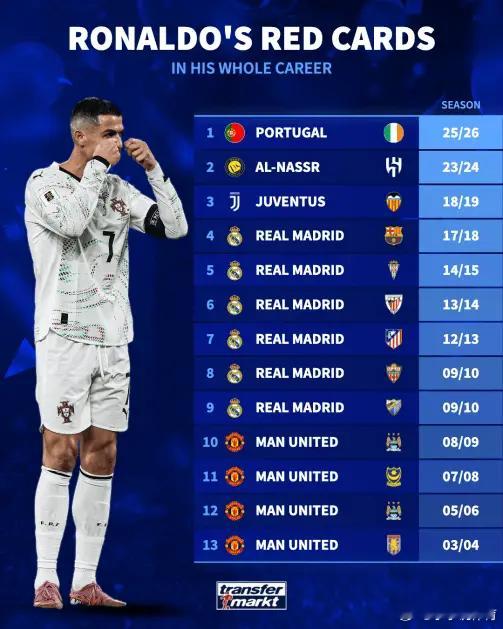 【奇怪的第一】德转盘点C罗13次红牌对手,曼城第一。C罗职业生涯红牌全记录C罗职业生涯首张红牌出现在2003/04赛季曼联的收官战。那日英格兰足坛见证阿森纳完成“不败赛季”的辉煌时刻,而C罗却因对阿斯顿维拉踢球发泄情绪领到第二张黄牌被罚下。如下图所示,C罗在老特拉福德的首段效力期内四次被罚下,其中两次是对阵同城死敌曼城,排名第一。这位传奇射手以438场451球的战绩成为皇马历史最佳射手,期间累计领到六张红牌。其中最著名的红牌出现在2017年西班牙超级杯对阵巴萨的比赛中。在第80分钟为皇马攻入制胜球助球队3-1取胜后,罗纳尔多仅两分钟后就领到第二张黄牌,巴萨球迷为此欢呼雀跃。这位葡萄牙队长还曾代表尤文图斯对阵瓦伦西亚时被罚下一次,效力沙特期间也领到过一张红牌。