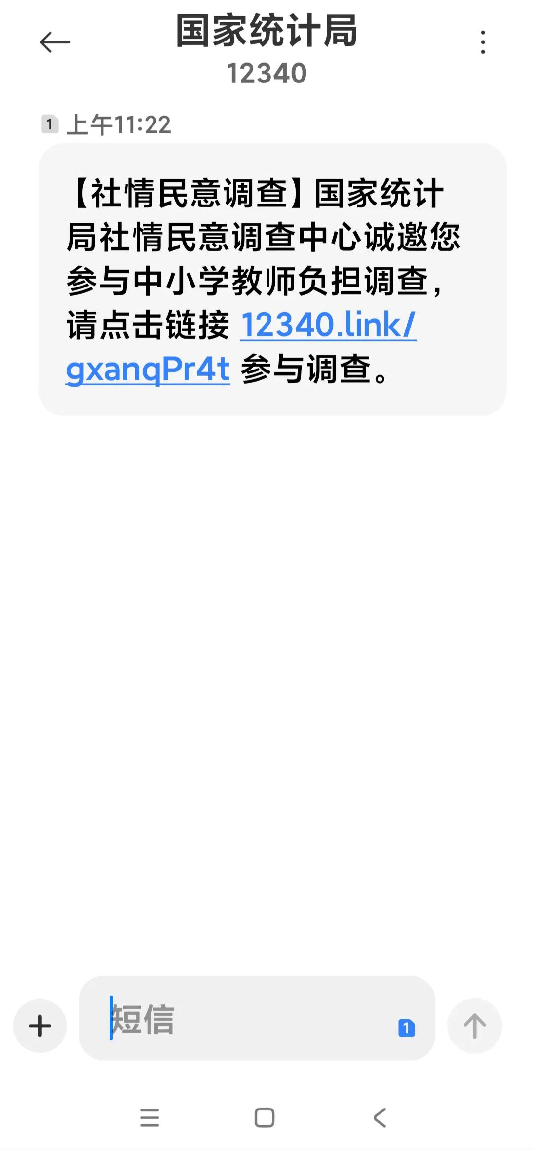 看到收到的短信,心里琢磨着要不要参与一下,脑海中突然闪过一个念头:“这会不会是诈骗短信?陌生链接可不能随便点!” 赶紧向豆包咨询,它回复道: 这并非诈骗,而是正规的社情民意调查。 “12340”是国家统计局社情民意调查中心的全国统一专用号码,用于开展各类民意调查,像这次的中小学教师负担调查。官方调查不会涉及银行卡号、密码、验证码等隐私信息,也不会要求下载APP或点击可疑链接。要是对调查的真实性有疑虑,可通过国家统计局官方渠道核实,以免因误解而错过表达社情民意的机会。 再次强调一下,“12340”是国家统计局社情民意调查中心的全国统一专用号码,用于开展各类民意调查,并非诈骗!中小学教师负担调查?自己都退休了,参与调查也没啥意义,还是忽略吧。