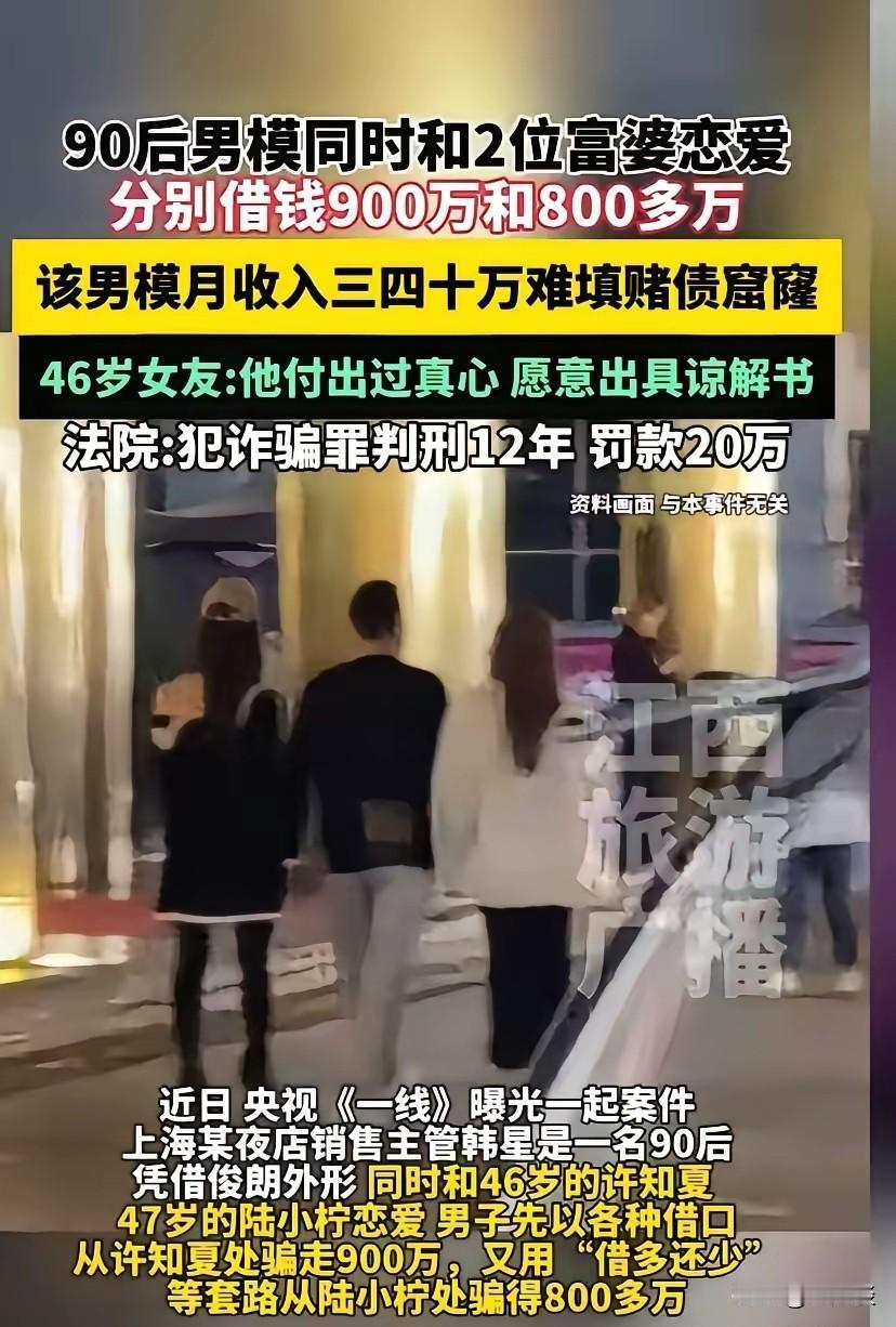 90后男模同时和两位富婆交往,分别骗得900多万和800多万,最终东窗事发,富婆还愿意为这位男模出具谅解书。所以说不光女人长得漂亮,有大把的男人愿意为她付出,花钱供她享受。同样,男人长得帅,也有大把女人愿意为他付出,给他钱花,即使被他骗了,可能全都心甘情愿了。这就是为什么要长得漂亮,要长得帅的原因。因为你的外形、长相,可以让你在成功的道路上不走弯路,能够让你直抵成功的顶峰。