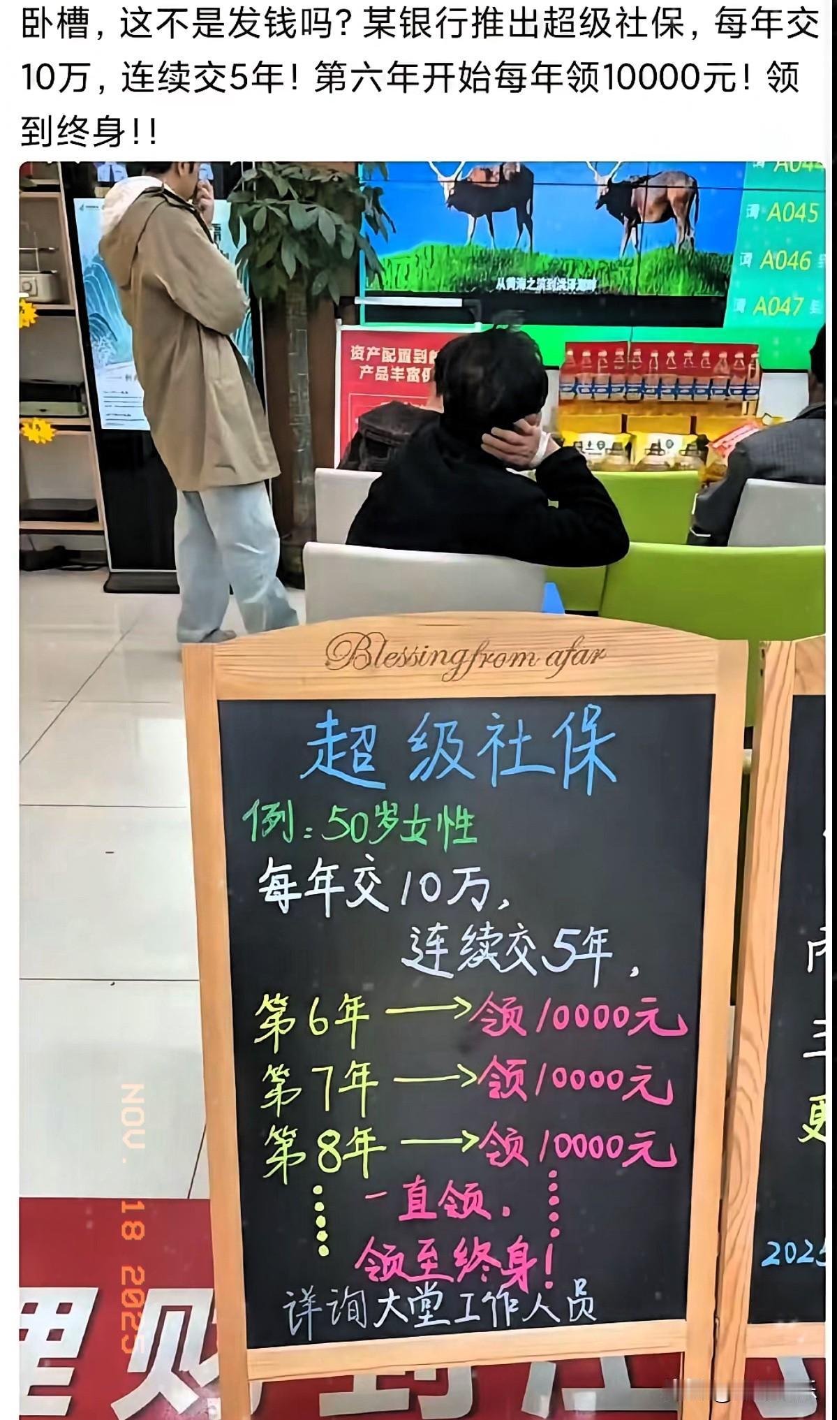 最近刷到某银行推的“超级社保” 看着挺诱人:每年交10万、连交5年,从第6年起每年领1万,能领终身。不少人第一眼觉得“这不是白给钱吗”? 但仔细算笔账就清醒了:前5年总共要交50万,之后每年领1万,光把本金领回来就得50年。要是50岁开始交,领回本金都到100岁了,这期间的通胀、资金贬值都没算进去。 看似“领终身”的福利,实际是用大额本金换极低的长期收益,普通人可别被“领终身”的说法冲昏头。理财还是得算清实际收益,别掉进文字陷阱里。 你们觉得这“超级社保”划算吗?评论区说说你的看法~