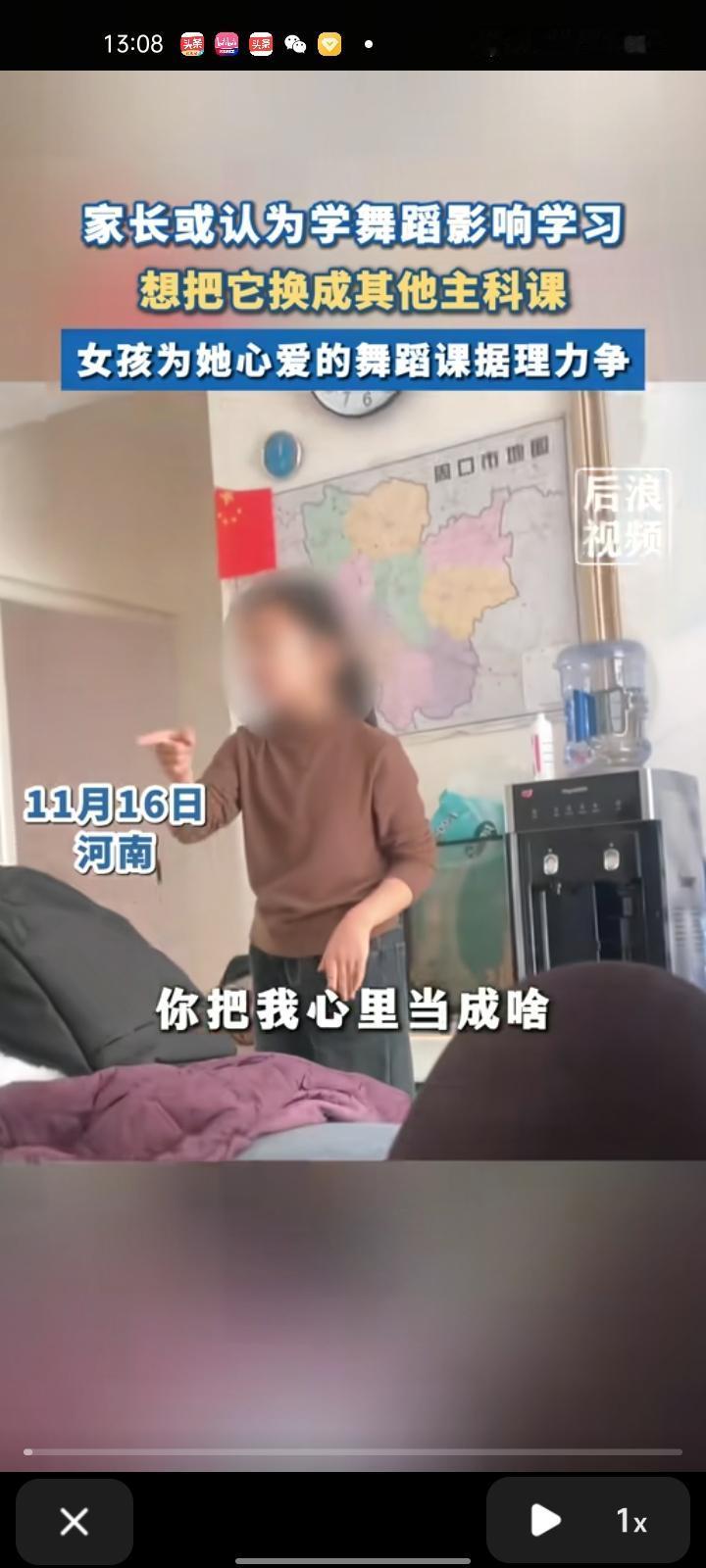 11月16日,河南周口。家长疑认为学舞蹈影响学习,想把它换成其它主科课,女孩为她心爱的舞蹈据理力争,说道:“你不知道我对舞蹈的热爱,总是停掉”。视频一发出,引起了网友们的争议。