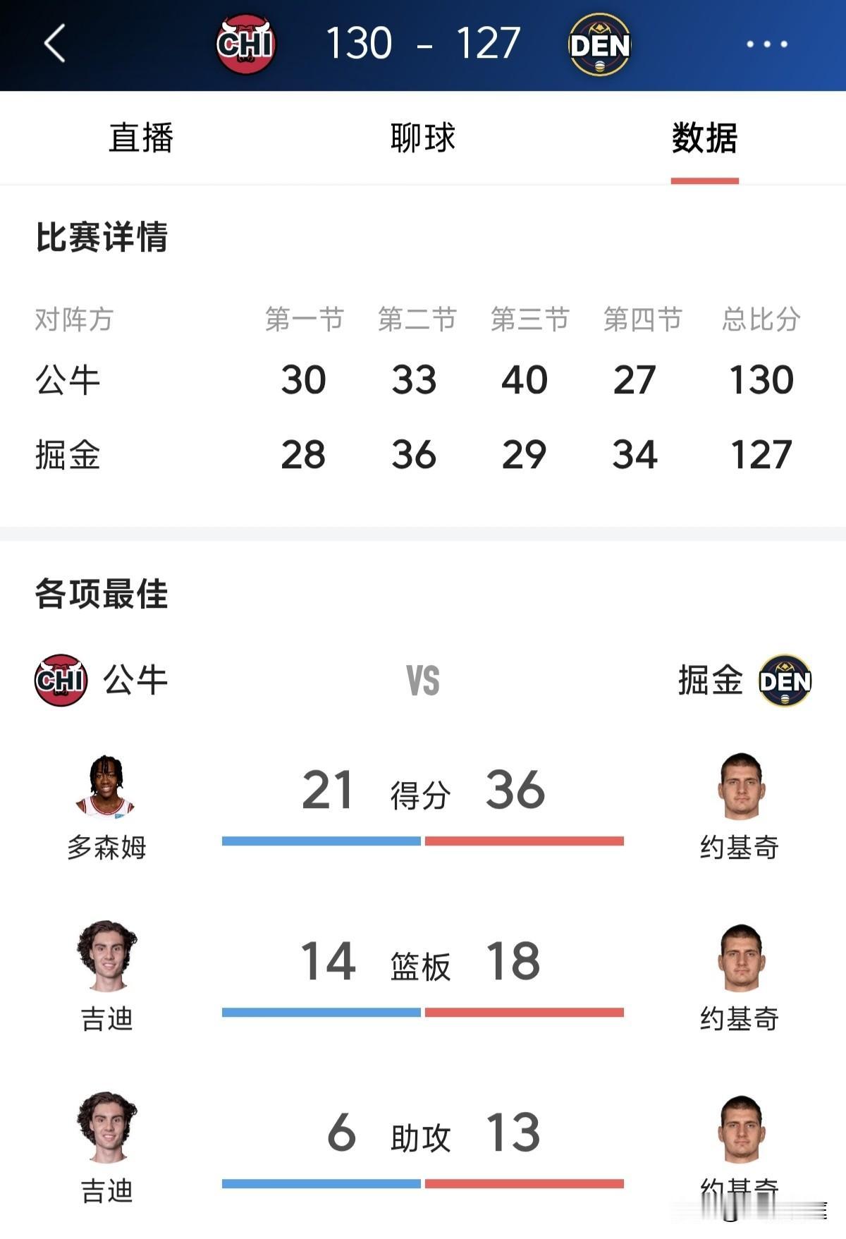 真的是乱拳打死老师傅!掘金主场不敌公牛,三分惜败无缘八连胜。今天约基奇拿到36分18篮板13助攻,数据还行,可惜球队输了!公牛现在什么情况呢?谁是当家球星你们知道不?真的没想到这场比赛掘金会输,不过还是排名西部前列,不影响球队!