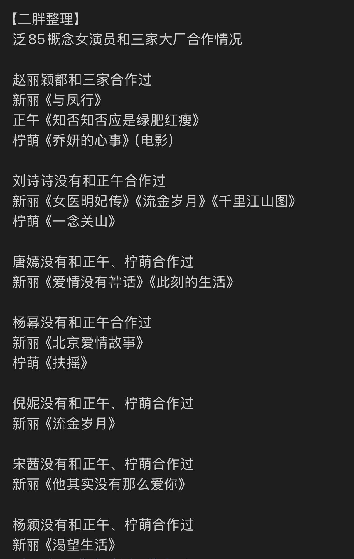 85女星三大厂合作情况,你幂也就当年《扶摇》这部算得上真的大厂…