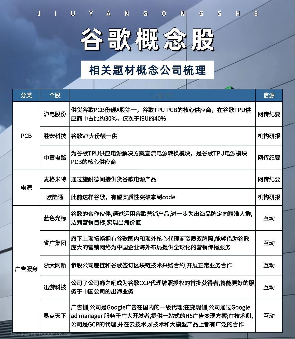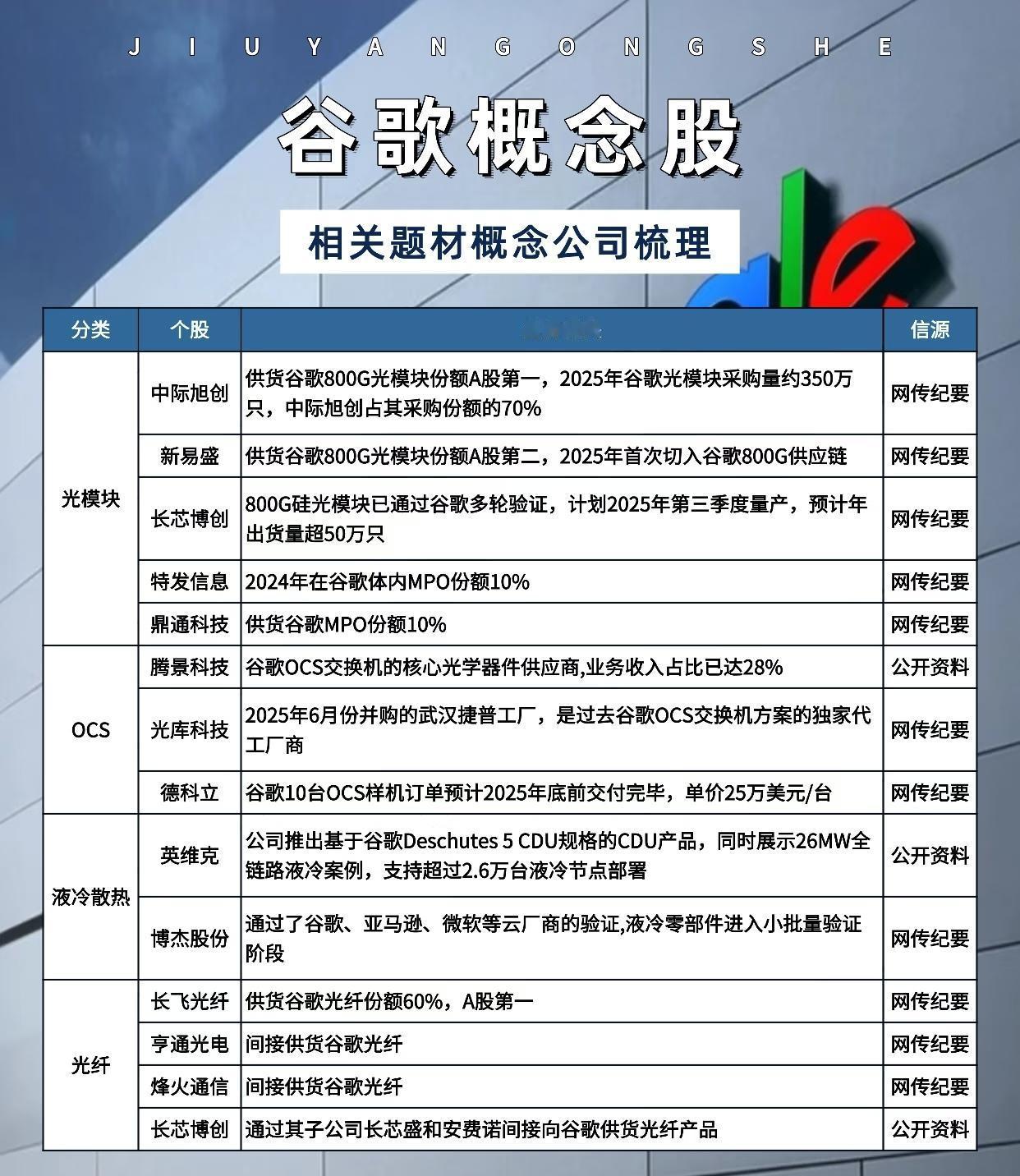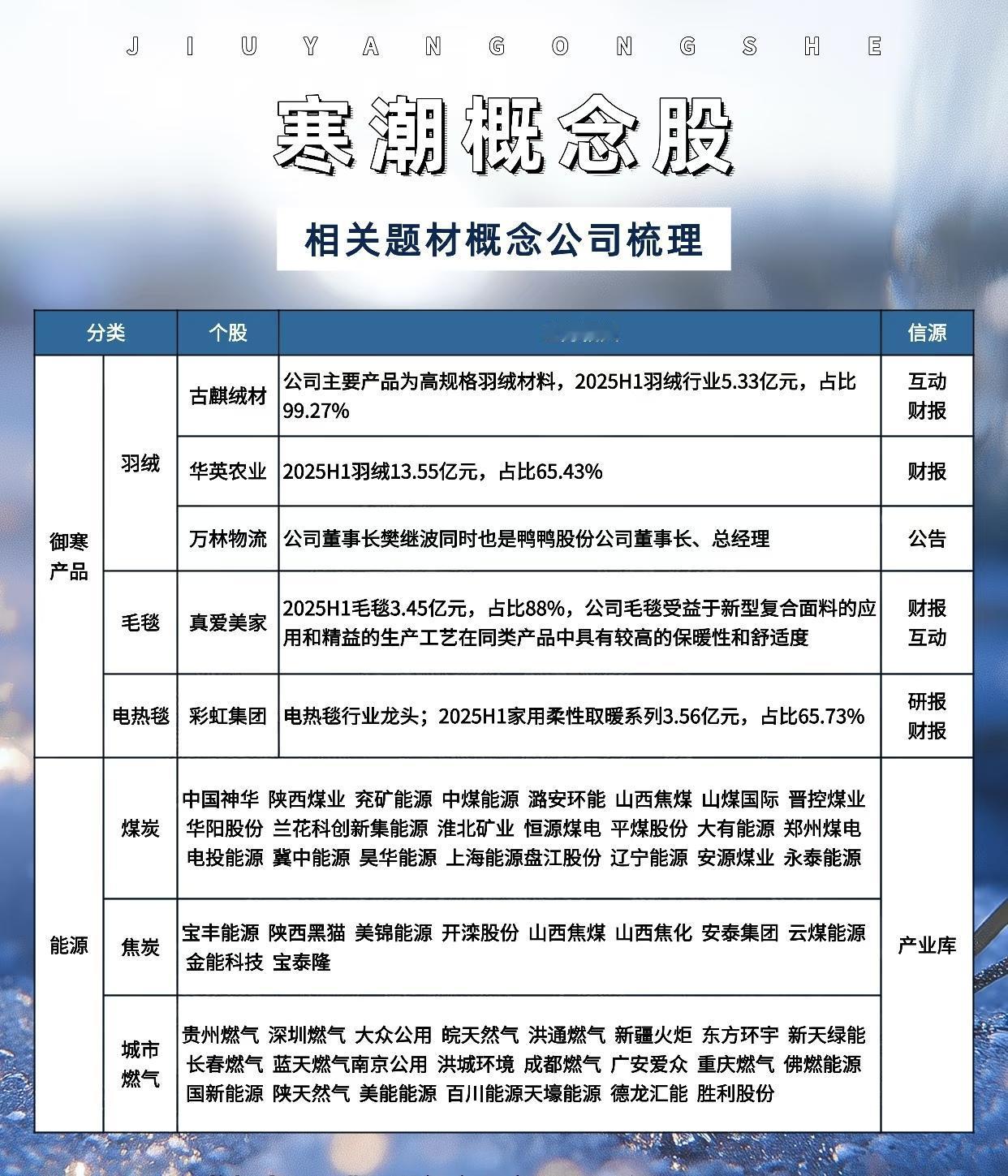 “寒潮概念”和“谷歌概念”相关的A股上市公司及其业务信息,下面为您分类总结如下: 一、寒潮概念股(相关题材概念公司梳理) 寒潮概念股主要涉及在极端寒冷天气或冬季供暖需求上升背景下,可能受益的行业与公司,主要包括以下几大类: 1. 供暖类(供热/暖及节能) 这类公司主要从事城市或区域供热、蒸汽供应、热网智能控制、节能设备等业务,在寒潮来临时,供暖需求激增,相关公司业绩往往受到积极影响。 主要公司及业务亮点: - 联美控股:2025年上半年供暖及蒸汽收入14.16亿元,占总营收的74.62%。 - 惠天热电:沈阳大型供热上市公司,2025H1供暖供气收入11.66亿元,占比96.35%。 - 京能热力:实控人为北京市国资委,2025H1热力服务收入6.55亿元,占比84.67%。 - 金房能源:专注北京地区供热,2025H1供热收入占97.59%。 - 廊坊发展:供热及制冷产品收入占97.88%。 - 瑞纳智能:供热节能服务收入0.74亿元,占比79.59%。 - 工大科雅:热网智能感知与调控系统收入0.67亿元,占比76.47%。 - 日出东方:中标西藏清洁供暖项目,总投资约17.67亿元。 2. 热泵类(空气能热泵等节能供暖设备) 热泵作为清洁、高效的取暖设备,在寒潮和能源转型背景下受到关注。 主要公司及业务亮点: - 日出东方:推进空气能热泵战略,产能约10万套,且有西藏大项目在手。 - 万和电气:2024年推出R290热泵,业内领先。 - 海鸥住工:旗下珠海爱迪生展示热泵锅炉控制技术。 - 小崧股份:通过收购普希电器布局热泵,2024年净利润416万元。 - 振邦智能:热泵为智能电器控制器的重要应用方向。 - 双良节能:中国最大溴化锂制冷机、吸收式热泵和空冷器生产商。 3. 御寒产品类 包括羽绒、毛毯、电热毯等直接与保暖相关的消费品企业。 主要公司及业务亮点: - 古麒绒材:主营高规格羽绒,2025H1羽绒业务占比99.27%。 - 华英农业:羽绒业务占2025H1营收的65.43%。 - 万林物流:董事长关联鸭鸭股份(服装品牌,含羽绒服)。 - 真爱美家:毛毯业务占88%,产品保暖性强。 - 彩虹集团:电热毯行业龙头,2025H1家用柔性取暖收入占65.73%。 4. 能源类(传统保暖与发电能源) 包括煤炭、焦炭、城市燃气等能源供应企业,是冬季供暖和电力保障的基础。 分类公司包括: - 煤炭:中国神华、陕西煤业、兖矿能源、中煤能源、潞安环能等(完整名单见图)。 - 焦炭:宝丰能源、陕西黑猫、美锦能源、开滦股份等。 - 城市燃气:贵州燃气、深圳燃气、大众公用、重庆燃气、成都燃气等众多城市燃气供应商。 二、谷歌概念股(相关题材概念公司梳理) 谷歌概念股是指与谷歌(Google)在业务上有直接或间接合作、为其提供产品或服务的A股上市公司,涵盖多个科技与制造细分领域。 1. 光模块 & OCS & 液冷散热 & 光纤 这些公司主要为谷歌提供数据中心关键硬件,如高速光模块、液冷系统、光纤连接、OCS(光电路交换)相关组件。 重点公司及合作内容: - 中际旭创:供货谷歌800G光模块,A股份额第一,占谷歌2025年采购量的70%。 - 新易盛:2025年首次进入谷歌800G光模块供应链,相关产品已通过验证。 - 特发信息:2024年占谷歌MPO(光纤连接器)份额10%。 - 鼎通科技:为谷歌OCS交换机供应核心光学器件,占其业务收入28%。 - 腾景科技 / 德科立 / 英维克 / 长飞光纤 / 亨通光电 / 烽火通信 / 长芯博创:涉及光纤、液冷、OCS样机等供货或合作,部分为独家或核心供应商。 2. PCB(印刷电路板)、电源、广告服务等 涵盖为谷歌提供PCB板、电源模块、数字营销与广告服务的公司。 重点公司及业务: - 沪电股份:谷歌PCB供应商中A股占比约30%,仅次于ISU。 - 胜宏科技:为谷歌V7产品线的大份额一供。 - 中富电路:为谷歌TPU(张量处理单元)供应直流电源模块,是核心PCB供应商。 - 麦格米特 / 欧陆通 / 蓝色光标 / 省广集团 / 浙大网新 / 迅游科技 / 易点天下: - 蓝色光标:利用谷歌营销产品服务中国品牌出海。 - 省广集团:拥有谷歌国内&海外核心广告代理双牌照。 - 易点天下:是Google广告一级代理,与GCP、AI及大模型有广泛合作。 - 迅游科技:子公司获谷歌CCP代理首批资格,服务中国企业出海。 - 浙大网新:参股公司趣链与谷歌有区块链技术合作。
