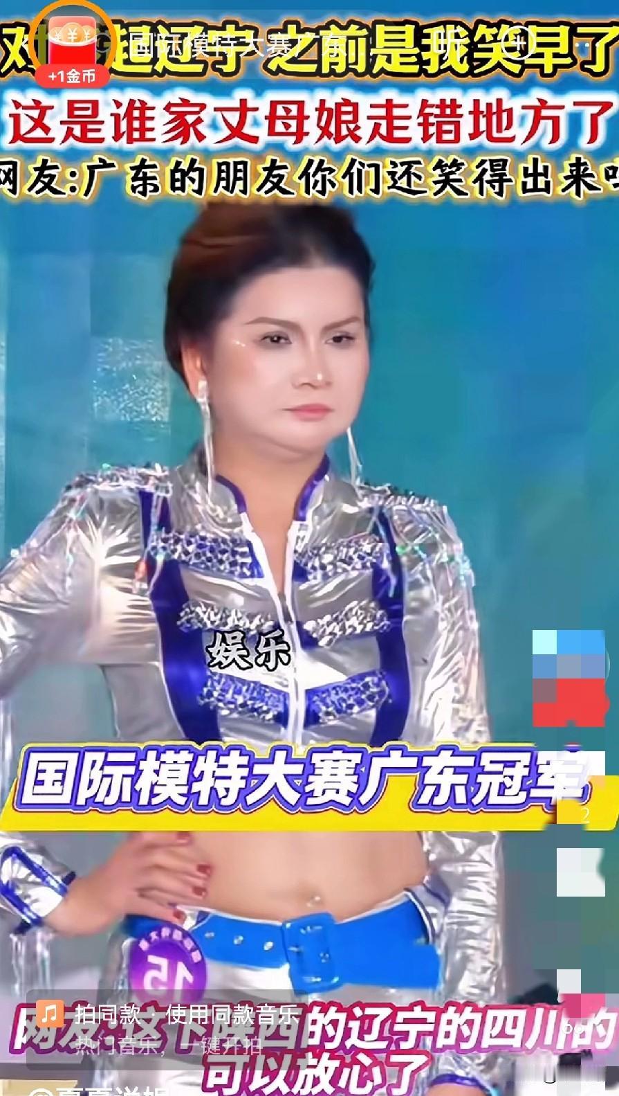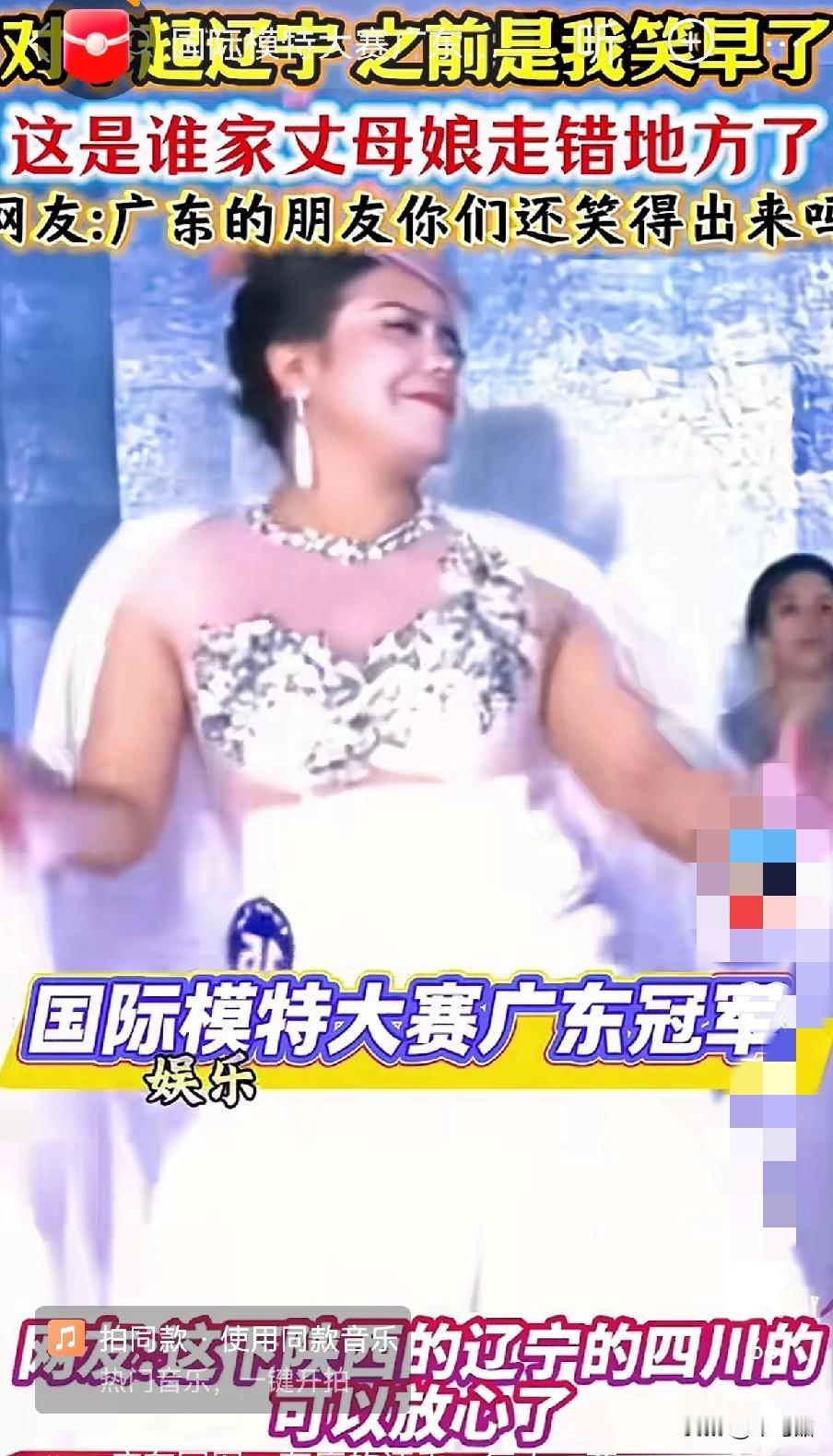 广东的朋友啊, 当初你们在笑, 辽宁和四川冠军的时候, 有没有想过, 还有更大的惊喜在后面? 这不广东赛区冠军来了, 带着她迷人的双下巴, 丈母娘的身姿, 收不住的小蛮腰, 大红色的指甲油, 踏着沉重的脚步来了, 她来了。 这可是模特大赛啊, 现在的要求这么低了吗, 不限年龄和胖瘦了吗? 只要身高达标就行。 这可是是广东呢, 也算是个美女如云的地方, 千挑万选就选了个这样的代表, 请收下我沉重的一声叹息啊, 白瞎我见过好多广东的美女啊。 广东的朋友, 请告诉我, 这是真的吗! (图片来自网络视频)