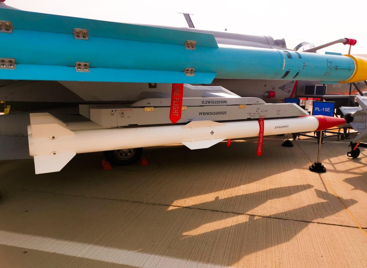 迪拜航展现场,挂载在JF-17C战斗机上的PL-15E和PL-10E空对空导弹。