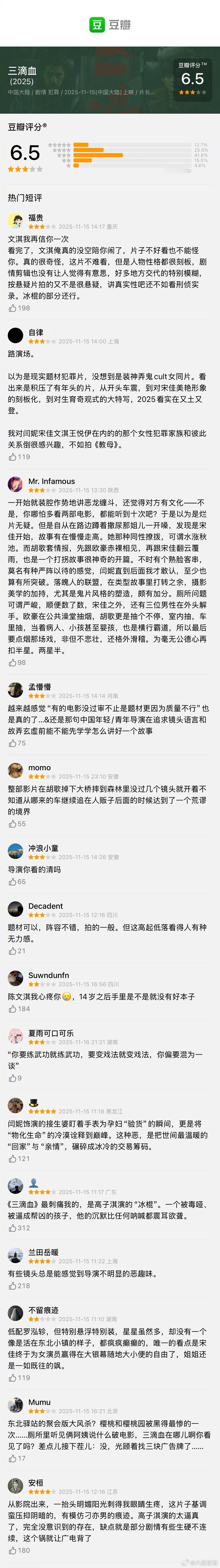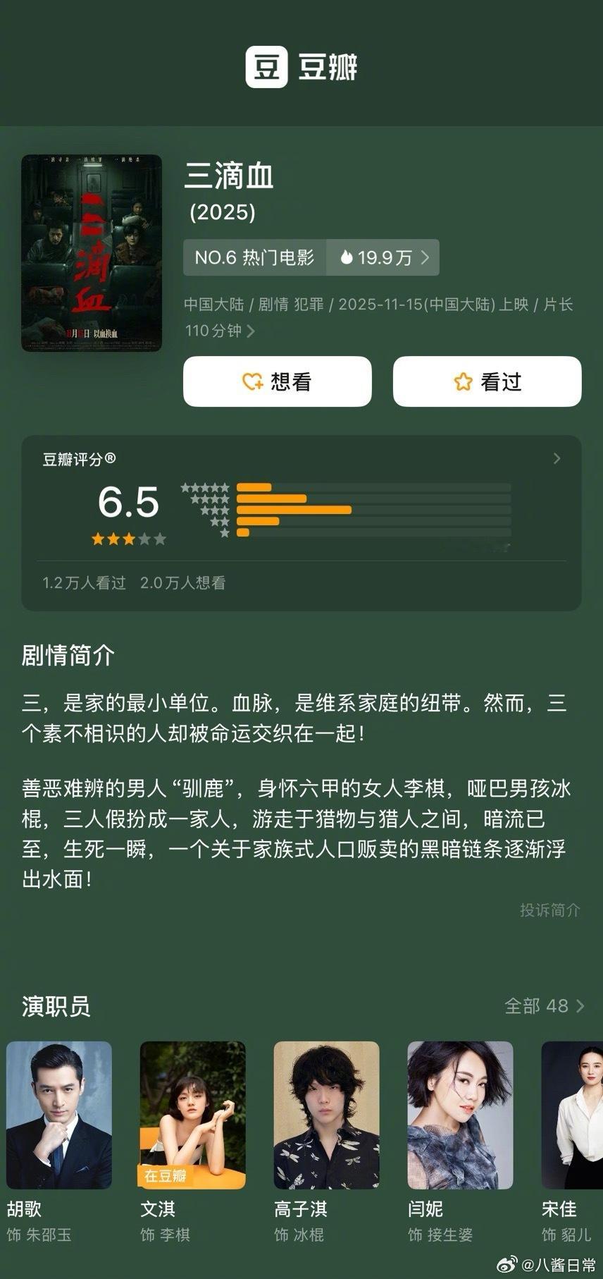 胡歌、文淇《三滴血》豆瓣开分6.5分