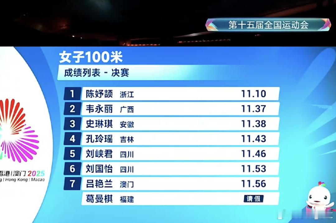 全运会女子百米决赛,浙江小将陈妤颉以11秒10获得冠军。这个成绩怎么样?往前数三届。2013年辽宁全运会女子100米冠军是陶宇佳,成绩为11秒48,时年26岁。2017年天津全运会女子100米冠军是韦永丽,成绩为11秒31,时年26岁。2021年西安全运会女子100米冠军是葛曼棋,成绩为11秒22,时年24岁。昨天夺冠的陈妤颉,出生于2008年12月底,年龄16岁,成绩为11秒10。这是全新的亚洲青年记录,这也让她成为全运会历史上最年轻的百米冠军。在此之前,陈妤颉已经打破了一系列青少年100米记录不夸张的说,亚洲女子百米将进入陈妤颉时代。