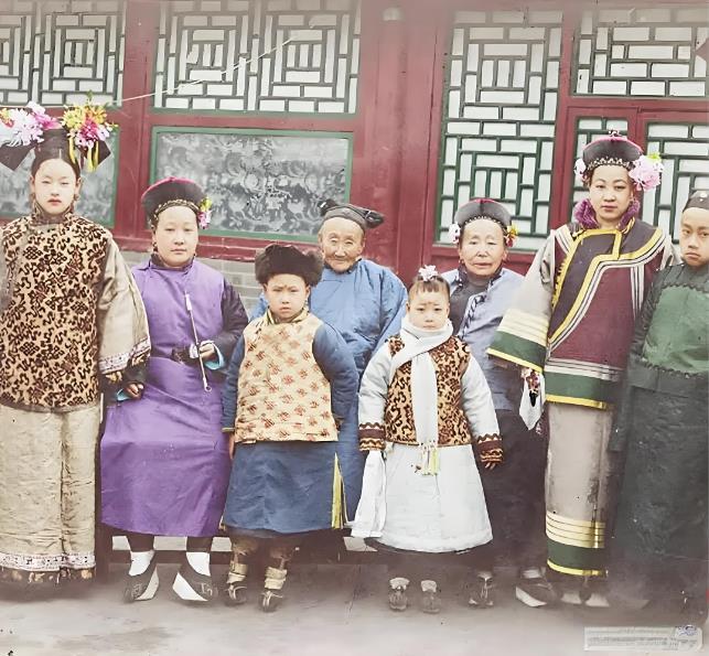 这张照片是清末北京旗人家庭的全家福,画面以一座雕花木棂的中式宅院为背景,窗格的几何纹样精致典雅,尽显大户人家的宅邸规制。 画面中人物涵盖老、中、幼三代,体现了清末 “四世同堂” 的家族理想:左侧两位女性梳着典型的旗人 “大拉翅” 头饰,身着织锦旗装,是家族中的女性主脉(正妻或有身份的妾室); 中间的老人头戴传统旗人老年妇帽,衣着朴素却神态祥和,是家族中的长辈;孩童们穿着绣花木棉坎肩、锦缎长袍,足见家境优渥,是家族未来的继承者