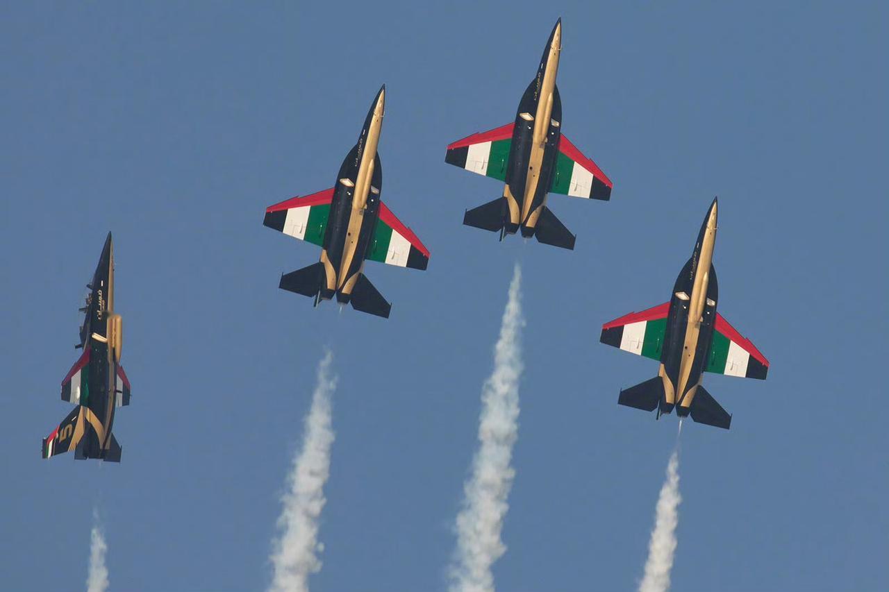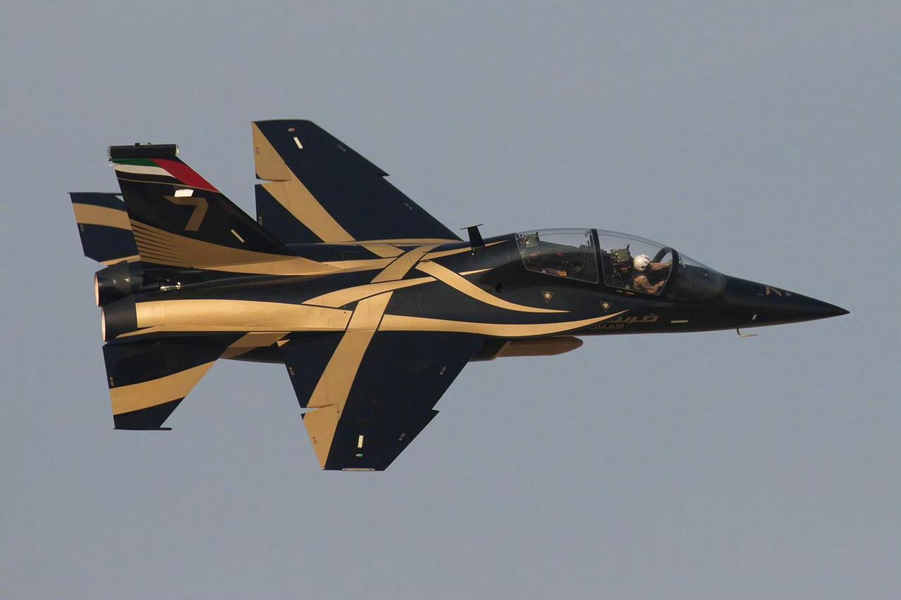 战机欣赏:在2025年迪拜航展上,阿联酋空军飞行表演队装备的L-15教练机正式亮相。该机采用了深蓝涂装,搭配金色,白色和红色的条纹。战斗机