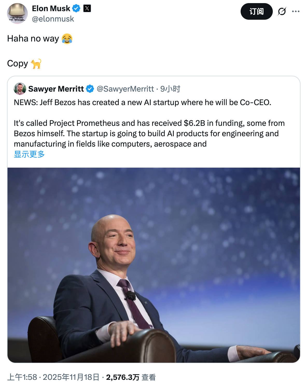 两位世界首富再一次吵起来了。贝索斯宣布带着 62亿美元回归一线,创办“普罗米修斯计划”,要做能在现实世界里动手做实验、造机器人、建生产线的 物理 AI。结果消息刚发酵,马斯克直接在 X 上转发:“Haha no way ,Copy cat ”。从卫星、火箭到自动驾驶,两人互怼了20年,但这一次,战场换成了现实世界 AI。但在热闹之外,两人同时All in 物理 AI,说明这条赛道的爆发速度会比任何人想象得更快。就看他们谁能率先把 从纸面推向工厂和火箭领域了。