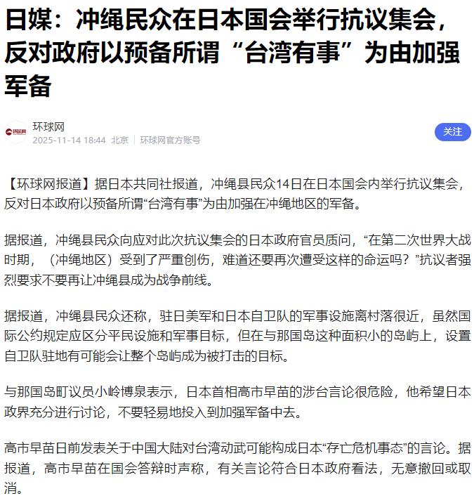 11月14日,冲绳县民众在日本国会内举行抗议集会,反对日本政府以预备所谓“台湾有事”为由加强在冲绳地区的军备。 他们这股子火气可不是突然冒出来的,是被几十年的军事阴影压得实在喘不过气,才终于爆发出来。日本政府嘴里说的“为台湾有事做准备”,在冲绳人听着,根本就是把自己家乡往战火里推的借口——这片土地,早就为战争付过太惨痛的代价了。 冲绳人对战争的怕,是刻在骨头里的。1945年那场上岛战役,美军和日军在这儿打得天昏地暗,战火扫过,十多万平民丢了性命,不少人还是被日军逼着“为天皇尽忠”,最后无奈自尽。 这段历史,至今都是冲绳人碰都不愿碰的疤。现在日本政府又拿“防卫需要”当幌子加军备,简直是往旧伤口上撒盐。 更让人寒心的是,冲绳的军事包袱就没真的轻过——驻日美军总共差不多5.5万人,一半多都扎在冲绳这块小地方;全日本70%的美军基地也都安在这儿,31处基地像补丁似的盖在岛上,把好端端的农田和海岸线占去了一大半。 这些军事存在带来的不只是心里发慌,实打实的危险和麻烦就没断过。 就说今年8月4号傍晚,嘉手纳空军基地附近的居民,眼睁睁看着一架美军F-15E战机拖着白烟、机身还带着火星子紧急迫降。 后来才知道,这架飞机刚起飞就掉了个轮子,机身擦着地面滑行的样子,让附近老百姓现在想起来还后背发凉。 可这事儿不是头一回,四个月前的4月,另一架临时派到这儿的F-15E,也出过起飞前轮胎掉下来的岔子,飞出去的零件差点砸中基地外的民房。 天上掉零件够吓人了,地上的糟心事也不少,驻冲绳美军有治外法权,调戏妇女、打架斗殴的事儿常发生,可冲绳县政府连管都管不了,只能一次次出来给老百姓道歉安抚。 军事基地还在一个劲儿扩张,把冲绳人的生存空间越挤越小。 日本政府好多年前就打算把普天间基地搬到名护市的边野古海域,冲绳人特意为这事儿搞了公投,结果七成多老百姓都投了反对票。可公投结果刚出来第二天,政府压根没把民意当回事,照样往海里倒沙子填海造地。 这种不把老百姓当回事的操作早有先例,现在又借着“台湾有事”的由头加军备,说白了就是看中冲绳离台湾才600多公里的位置,想把这儿打造成所谓的“防御前哨”。 但冲绳人心里门儿清,真要是起了冲突,他们家乡肯定第一个变成战场,那些新添的雷达站、弹药库,哪是什么保护伞,分明是引火的柴堆。 经济上的委屈,冲绳人更咽不下去。这地方靠着暖和的天气和干净的海水,把旅游业做得有声有色,八成当地人都靠这个吃饭;苦瓜、菠萝这些农产品也长得好,产量在日本都是头一份,2021年光农业产值就达到922亿日元。 可军事基地把发展的路堵得死死的——机场的噪音一吵,游客全被吓跑了;基地周边的污染一闹,种出来的东西根本卖不出去。 结果就是,冲绳人的平均收入常年只有日本全国水平的七成,成了日本最穷的地方之一。 日本政府只想着在这儿堆武器,压根没考虑过怎么让当地人过好日子,甚至老百姓一抗议,就拿“国家利益”当挡箭牌,这厚此薄彼的做法,明眼人都能看穿。 联合国都专门派人来日本查过美军基地的“放毒”问题,结果发现基地周边的土壤和水里,有害物质超标好几倍,当地小孩得白血病的概率,比日本别的地方高出一大截。 11月14日国会前的抗议人群里,有位老人举着父亲的照片,照片上的年轻人在1945年的战火里没了性命,老人红着眼圈说“不想让孙子再遭一遍罪”。 这话说出了所有抗议者的心里话,他们反对的不是什么“国家防卫”,而是政府把冲绳人的命当棋盘上的棋子,拿他们的家乡去换政治博弈的资本。 日本政府总说在冲绳加军备是为了“安全”,却故意装看不见最基本的道理——真正的安全,从来不是靠堆武器堆出来的,是让老百姓晚上睡觉不用怕战机掉下来,不用为孩子的健康揪着心,不用在和平年代还活在战争的阴影里。 冲绳民众的抗议声,是在提醒政府这个简单的道理,也是对漠视民意的政府最硬气的质问。毕竟,谁都没有土生土长在这片土地上的人,更有资格决定家乡该过什么样的日子。 日本政府总说加强冲绳军备是为了“安全”,却选择性忽略了最基本的常识——真正的安全从来不是靠堆砌武器实现的,而是让民众不必在睡梦中担心战机坠落,不必为孩子的健康忧心忡忡,不必在和平年代仍活在战争的阴影里。 冲绳民众的抗议声,是对这种常识的呼唤,也是对漠视民意的政府最有力的质问,毕竟没有人比生活在这片土地上的人,更有资格决定自己家乡的未来。