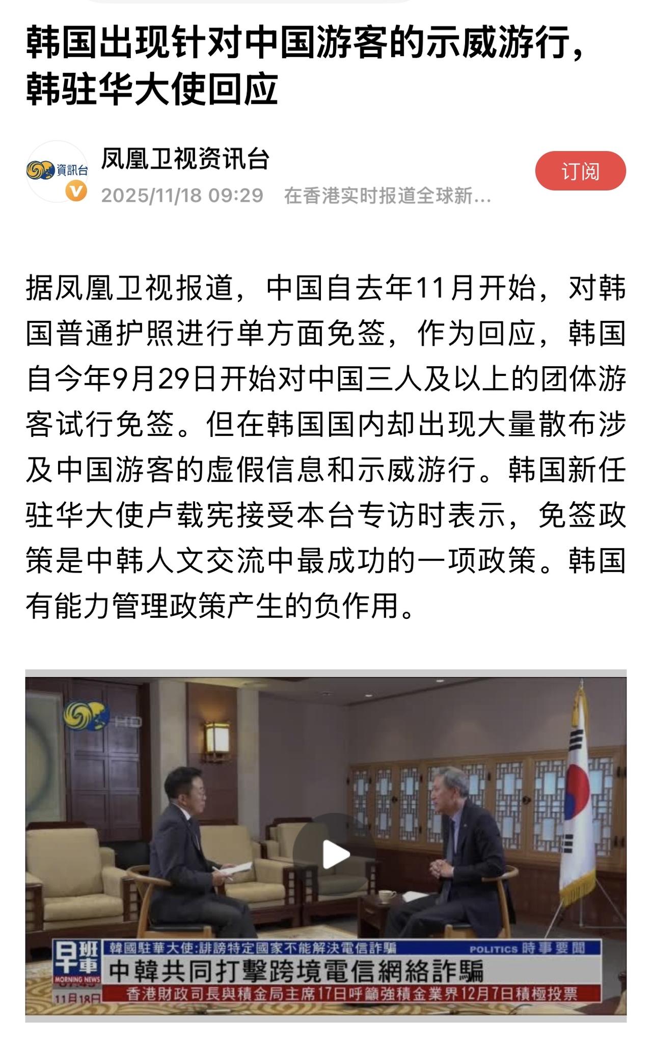 韩国新任驻华大使卢载宪在就任一个月之际接受凤凰卫视独家专访时表示,韩中关系如同“风与石头”,合拍时可长远发展,不合则易随波逐流,双方应不忘建交初心、相互尊重。