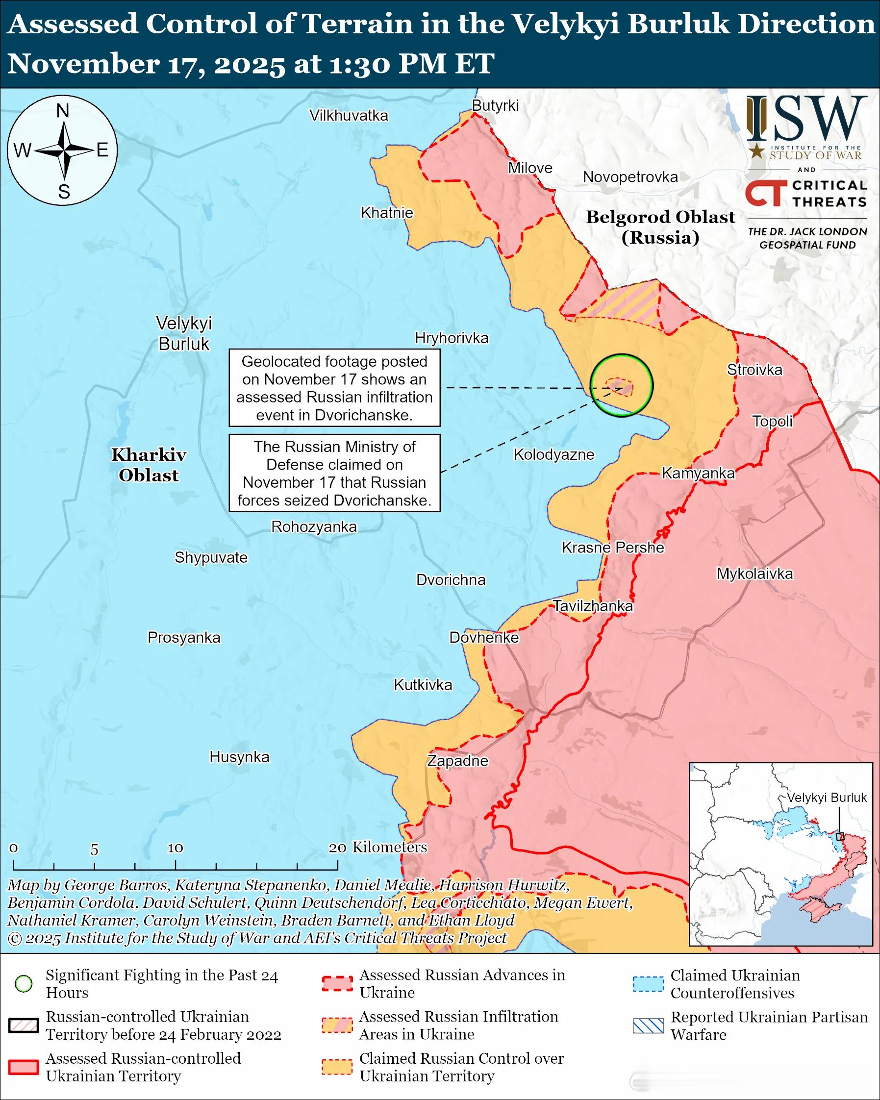 俄罗斯主要行动:乌克兰东部俄军主要行动1俄罗斯的目标:将乌克兰军队从与别尔哥罗德州接壤的国际边界击退,并使其进入哈尔科夫市的火炮射程之内。11月17日俄军继续在哈尔科夫州北部展开进攻行动,但并未取得进展。11月16日和17日,俄军在哈尔科夫市东北部的沃夫昌斯克及其附近地区以及锡涅尔尼科韦附近发动进攻。作战序列:据报道车臣谢赫·曼苏尔志愿营(隶属于俄罗斯国防部)的(FPV)无人机操作员继续在哈尔科夫方向打击乌克兰车辆和阵地。第20辐射、化学、生物和化学防御旅(列宁格勒军区)的TOS-1A温压火炮正在打击哈尔科夫州的乌克兰阵地。11月17日俄军继续在韦利基布尔卢克方向发动进攻,但并未取得确切进展。评估的俄军渗透行动:11 月 17 日发布的地理定位视频显示,俄第 9 摩托化步兵团(第 18 摩步师,第 11 军 [AC],LMD)在德沃里昌斯克市中心(大布尔鲁克东南)升起了一面旗帜。ISW 评估认为这是一次俄军渗透行动。ISW 无法独立核实俄军部队渗透到德沃里昌斯克的可能路线。未经证实的说法:包括俄罗斯国防部在内的俄罗斯消息人士声称,第 9 摩步团占领了德沃里昌斯克。11 月 16 日和 17 日,俄军在韦利基布尔卢克东北部的哈特涅和米洛韦附近、韦利基布尔卢克东部的奥布希夫卡附近以及韦利基布尔卢克东南部的德沃里昌斯克附近发动了进攻。库皮扬斯克区军事管理局局长安德烈·卡纳舍维奇表示,11月16日晚,俄军使用“格朗-2”无人机袭击了韦利基布尔卢克和布里亚基夫卡(韦利基布尔卢克以北)的居民区,造成一名平民死亡,另一名平民受伤。作战序列:据报道俄第83摩步团(第69摩步师,第6集团军[CAA],LMD)的FPV无人机操作员正在哈特涅附近袭击乌克兰车辆。