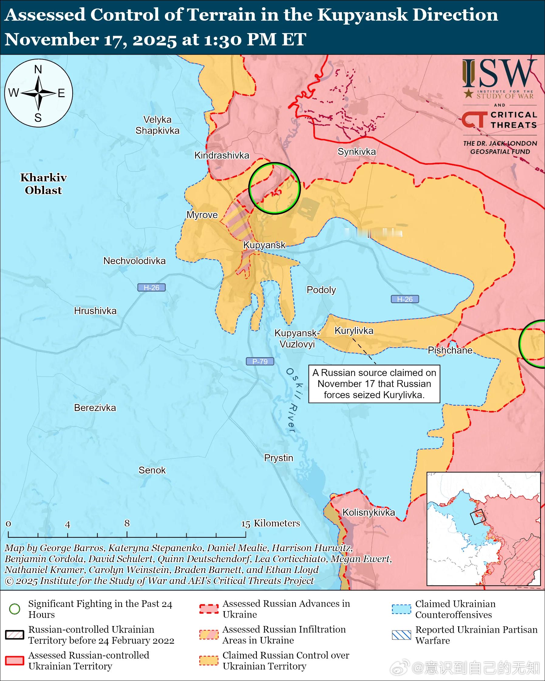 俄军主要行动2俄军目标:占领卢甘斯克州剩余部分,向西推进至哈尔科夫州东部,并包围顿涅茨克州北部。11月17日俄军继续向库皮扬斯克方向发起进攻,但并未取得任何确切进展。未经证实的说法:一位俄罗斯军事博主声称,俄军占领了库里利夫卡(库皮扬斯克东南部)。这位俄罗斯军事博主驳斥了关于俄军占领索博利夫卡(库皮扬斯克西部)的说法,并承认乌克兰军队每天都从该定居点进行反击。俄罗斯声称占领的区域范围:11 月 17 日发布的地理定位视频显示,乌克兰军队在库皮扬斯克东部地区活动——此前俄方声称俄军在该地区驻扎。11月16日和17日,俄军在库皮扬斯克市内及附近地区、库皮扬斯克东部的库切里夫卡附近以及库皮扬斯克东南部的皮什恰内、斯捷波瓦·诺沃谢利夫卡和库里利夫卡附近发动进攻。包括俄罗斯国防部在内的俄罗斯官方消息称,乌克兰军队在库皮扬斯克市内以及大沙普基夫卡(库皮扬斯克西北部)、拉德基夫卡(库皮扬斯克北部)、米罗韦、波多利(均位于库皮扬斯克西部)、奥西诺沃(库皮扬斯克南部)、赫卢什基夫卡、萨多韦和布拉霍达季夫卡(均位于库皮扬斯克西南部)附近进行了反击。乌克兰第十军于11月17日报告称,俄方声称其军队占领库皮扬斯克东岸(左岸)并包围波多利的乌克兰军队的说法不实,因为俄军并未在这些地区驻扎。乌克兰联合部队特遣部队发言人维克托·特列胡博夫上校表示,俄军在库皮扬斯克境内升旗,意在谎称俄军取得进展。特列胡博夫还表示,乌克兰军队正在库皮扬斯克北部消灭俄军。战斗序列:据报道俄第 121 摩步团(第 68 摩步师,第 6 集团军,列宁格勒军区)正在库皮扬斯克作战。11 月 16 日和 17 日,俄军攻击了克鲁利亚基夫卡、扎赫里佐韦和博胡斯拉夫卡附近的博罗瓦东北部以及赫雷基夫卡附近的博罗瓦东南部并向切尔内什奇纳进攻,但没有推进。11月17日俄军继续在斯拉维扬斯克-利曼方向发动进攻,但并未取得进展。俄军于 11 月 16 日和 17 日向莱曼方向进攻;在莱曼西北部的德罗比舍韦、科罗维亚尔和新谢利夫卡附近;在莱曼北部的新米尔、卡尔皮夫卡和斯塔夫基附近;在莱曼东北部的扬波利夫卡和捷尔尼附近;在莱曼东部的扎里奇涅和马斯利亚基夫卡附近;以及在莱曼东南部的扬皮尔附近。一个在莱曼方向作战的乌军旅的发言人报告说,训练有素的俄军部队(通常以破坏和侦察小组的形式行动)和训练不足的部队都在试图渗透到乌克兰阵地,然后集结起来发动进一步的攻击。该发言人表示,俄军正试图利用雾天发动更大规模的攻击。作战序列:据报道俄第9摩步团(隶属第18摩步师、第11集团军、LMD)正在扬皮尔附近作战。隶属于中央军区第25集团军第164摩步旅的“海伯利安”无人系统营的无人机操作员正在斯塔罗杜比夫卡(莱曼以南)附近袭击乌克兰车辆。第237坦克团(隶属第3摩步师、第20集团军、莫斯科军区)和第16特种旅(隶属俄罗斯总参谋部情报总局)继续向莱曼方向作战。
