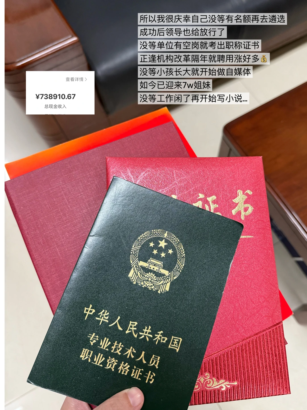 所以我很庆幸自己没等有名额再去遴选,成功后领导也给放行了;没等单位有空岗就考了职称证书[清单R]。正逢机构改革隔年就聘用涨好多工资;没等小孩长大就开始做自媒体,如今已迎来7w姐妹。加上写小说、投稿三个副业收入稳定月入3w,填补了编制唯一的缺憾。