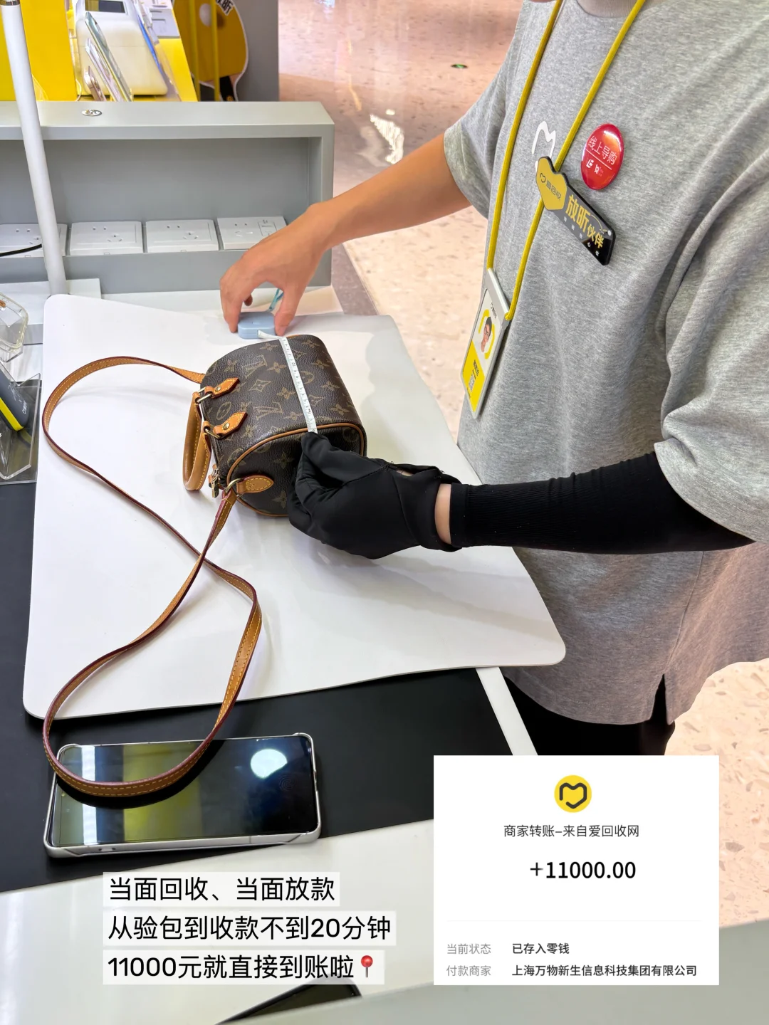 整个过程特别顺畅,全国2000多家门店就是方便。当面回收,当面放款,从验包到收款,全程不到20分钟,11000元就直接到账了。不用留着占地方、占钱财就能再买新的啦。