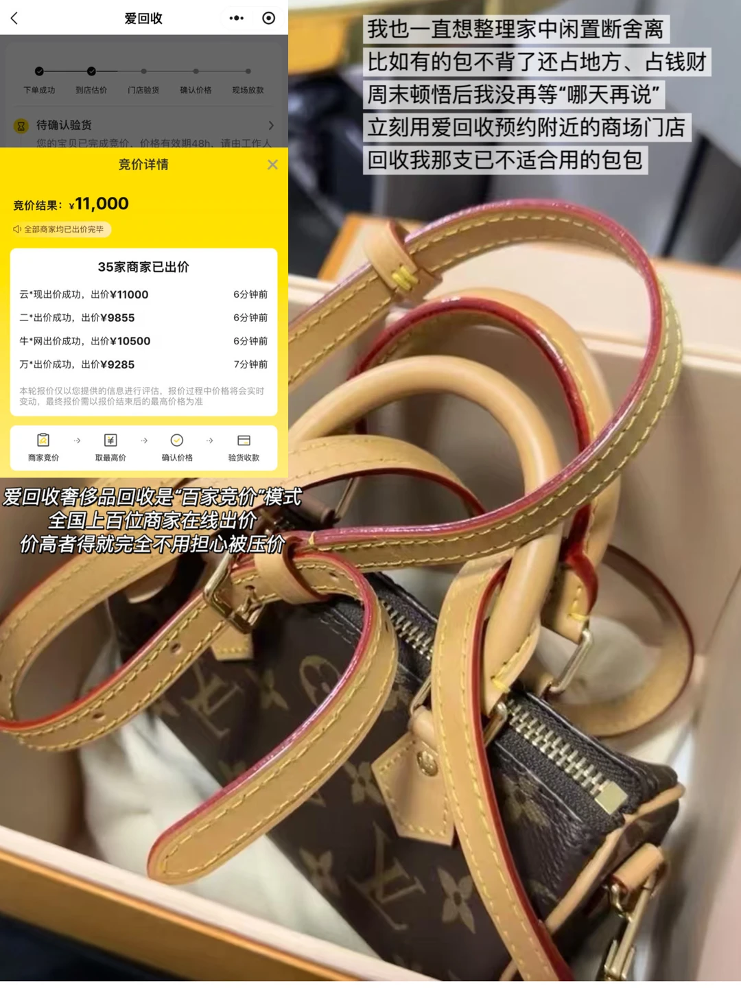 好在周末突然又顿悟,于是我没再等“哪天再说”,而是用爱回收抓紧预约了附近商场门店,回收我那支已不再适合用的包包👜爱回收的奢侈品回收是“百家竞价”模式,全国上百位商家在线出价,价高者得,系统会自动匹配出价最高的商家,完全不用担心被压价或到手刀。我那只好几年没用的闲置包,拍出了比预期更高的价格。