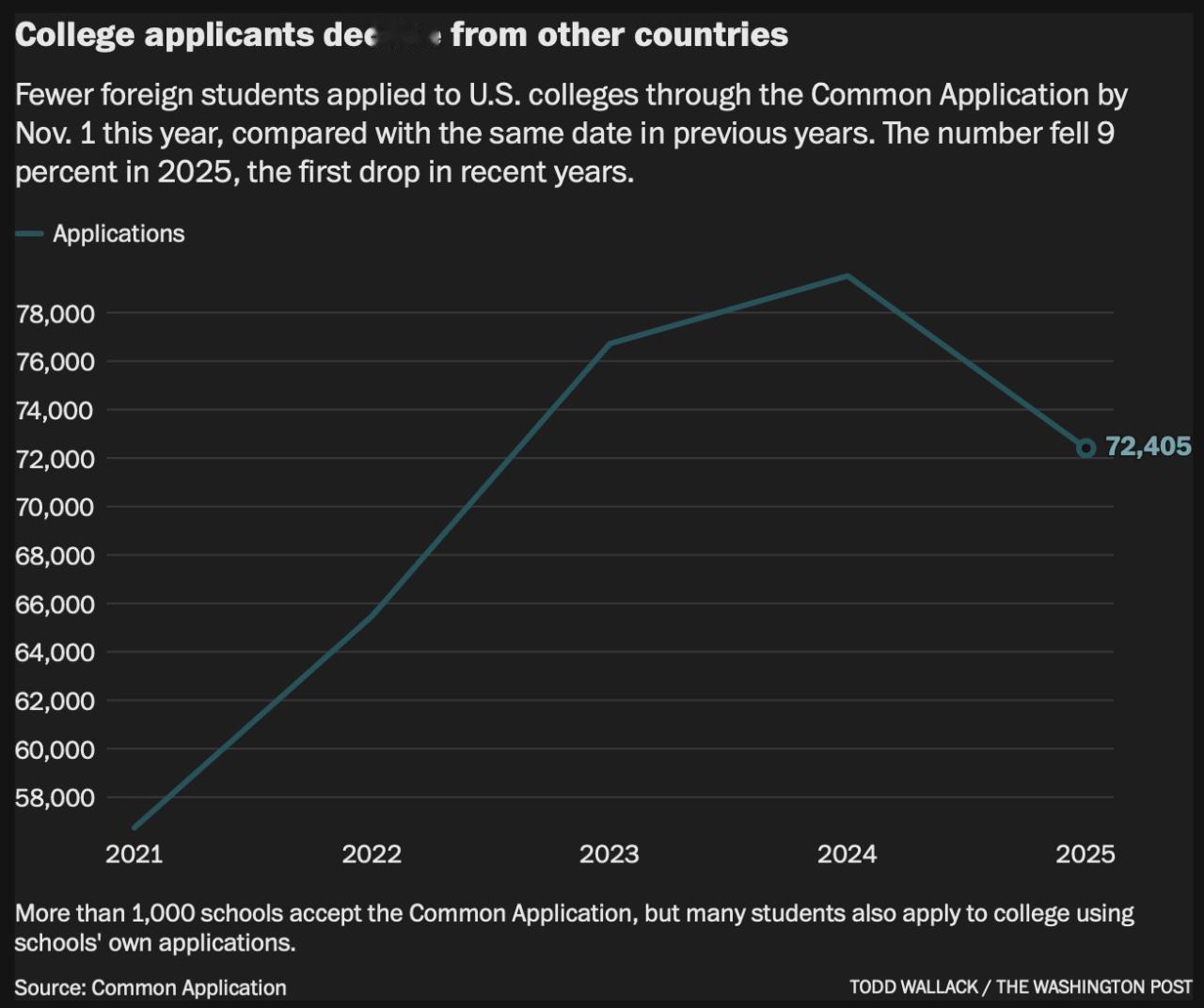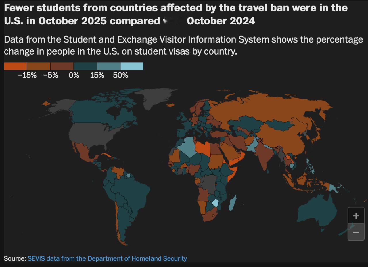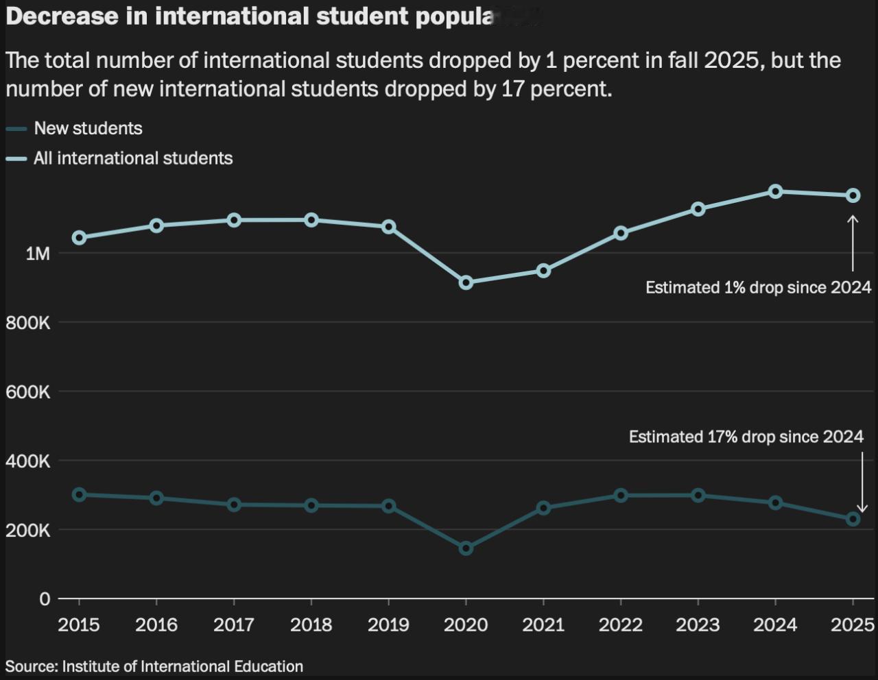 美国高校今年秋季新入学的国际学生人数大跌17%,为多年来最明显的下滑。根据国际教育协会周一发布的调查,这一下降与特朗普政府近月来收紧签证政策直接相关,包括扩大旅行限制、要求学校控制外籍学生规模、暂停签证面谈以强化社交媒体筛查,并取消参与抗议或涉嫌违规学生的签证。尽管留在美国从事实习或培训的研究生人数上升,使整体国际学生总量仅微降1%,各校差异仍十分明显。新申请数据也显示趋势未止步:截至11月1日的“通用申请”系统统计,明年秋季计划赴美留学的国际申请者减少9%,亚洲与非洲降幅最大。 专家指出,这一收缩正在削弱美国作为全球人才中心的地位。部分学校和行业团体估算,新生减少已造成近11亿美元经济损失及约2.3万个岗位流失。限制措施也令学生面临更强不确定性,从全额奖学金获录的个案到名校录取被迫推迟,签证延宕与拒签的个人影响正在扩大。与此同时,美国本土申请者增加7%,全国高教总体入学人数上升2%。不过,国际学生仍占美国大学生总数约6%,高校普遍担忧持续的政策压力会进一步削弱科研、收入与校园多元性。 美国 留学生 热点解读 热点现场 海外新鲜事 图片来源于网络