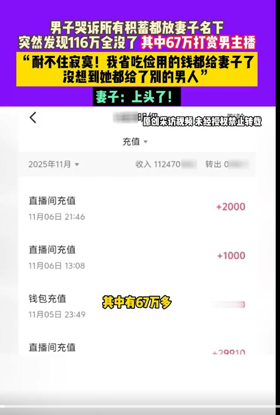妻子上头直播,挥霍67万打赏男主播,丈夫得知痛哭。 河南郑州得刘先生和妻子结婚八年,自己在外打工省吃俭用,住300一月得房子,把116万得存款全部交给妻子保管。回家发现钱被用得一分都不剩,急死了丈夫。 据了解,丈夫出于信任把钱交给妻子保管后,妻子迷上了直播,光打赏男主播就花了67万,剩下的钱妻子也说不清楚用到了哪里去,而妻子在丈夫面前保证自己只是打赏他们pk,没有私下见面。丈夫很气愤决定要回部分钱和妻子离婚。 这个妻子也是厉害了,自己在挥霍116万的时候都不想一下自己在外努力挣钱的丈夫吗? 我觉得当今社会,不管男女,现在挣的钱应该自己保管,安全感是自己给自己的,感情都不一定可靠。