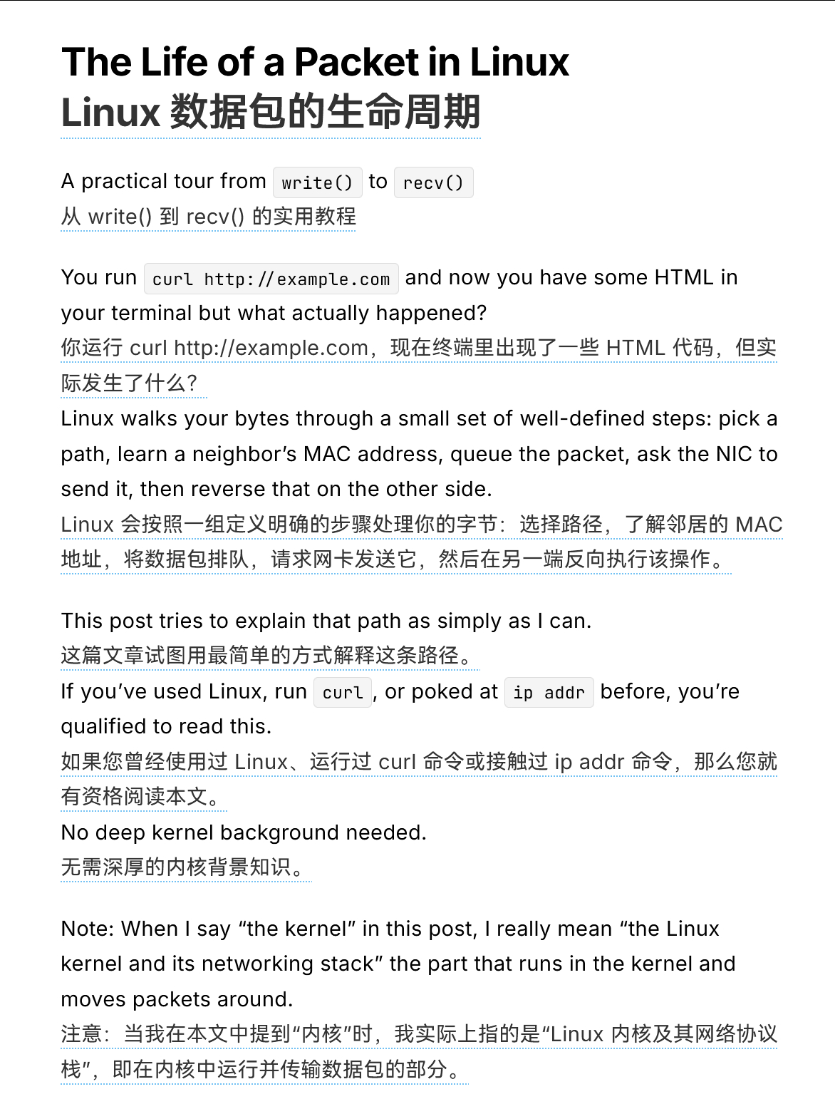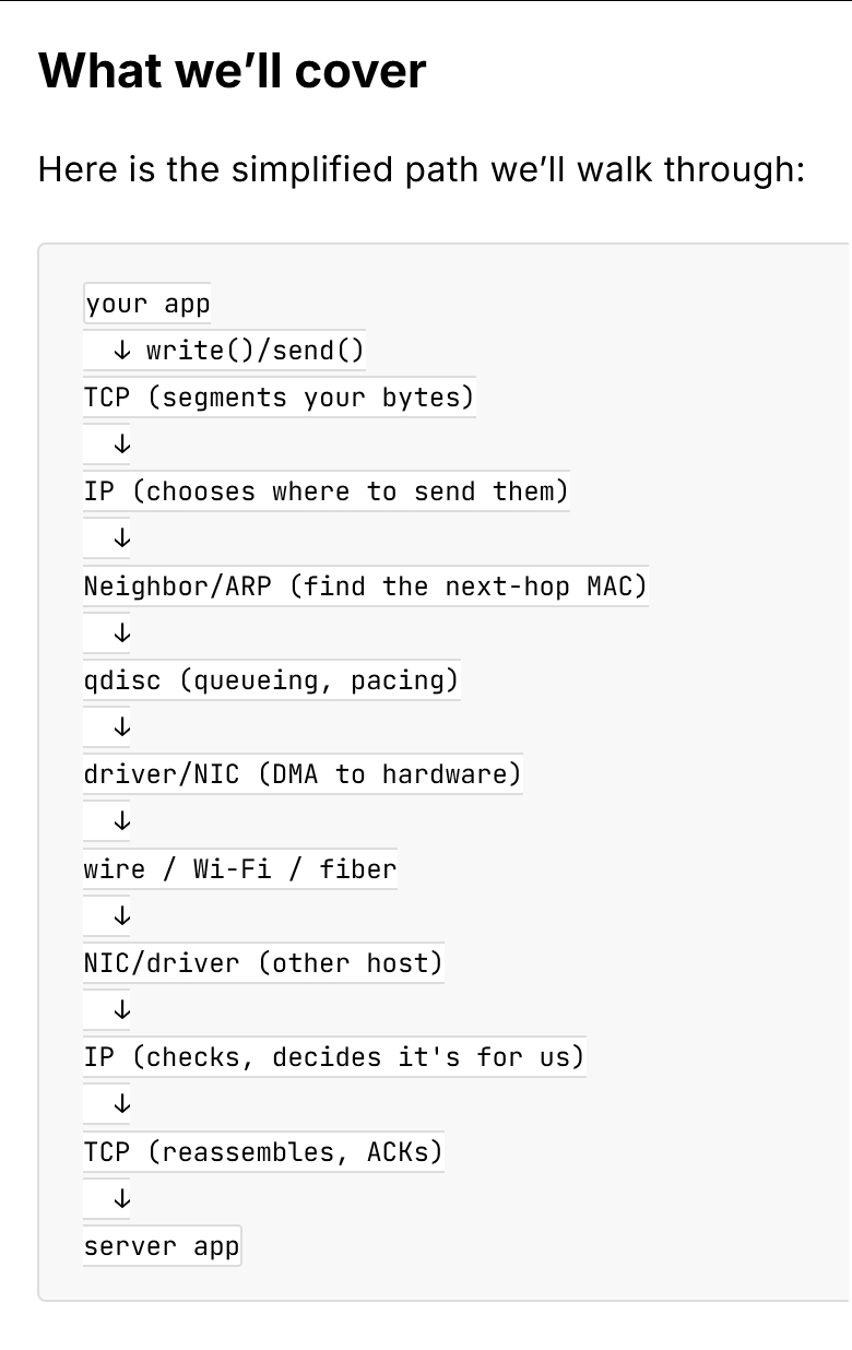 Linux中数据包的一生www.0xkato.xyz/life-of-a-packet-in-the-linux-kernel/这篇文章以curl 访问一个网站为例,介绍了数据包在Linux系统中从应用程序发送到接收的完整路径。包括Linux网络数据包从send()到recv()的九大核心步骤,涵盖套接字、TCP/IP协议栈、路由、ARP、队列管理、DMA、NAPI、防火墙、NAT等关键机制,结合命令实践,帮助开发者理解底层网络通信原理,可以看作是Linux网络栈入门指南。