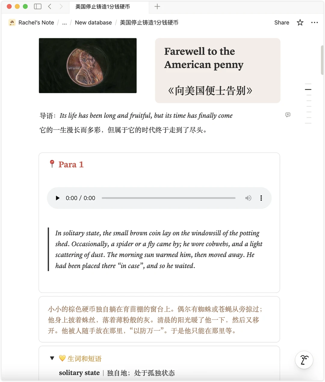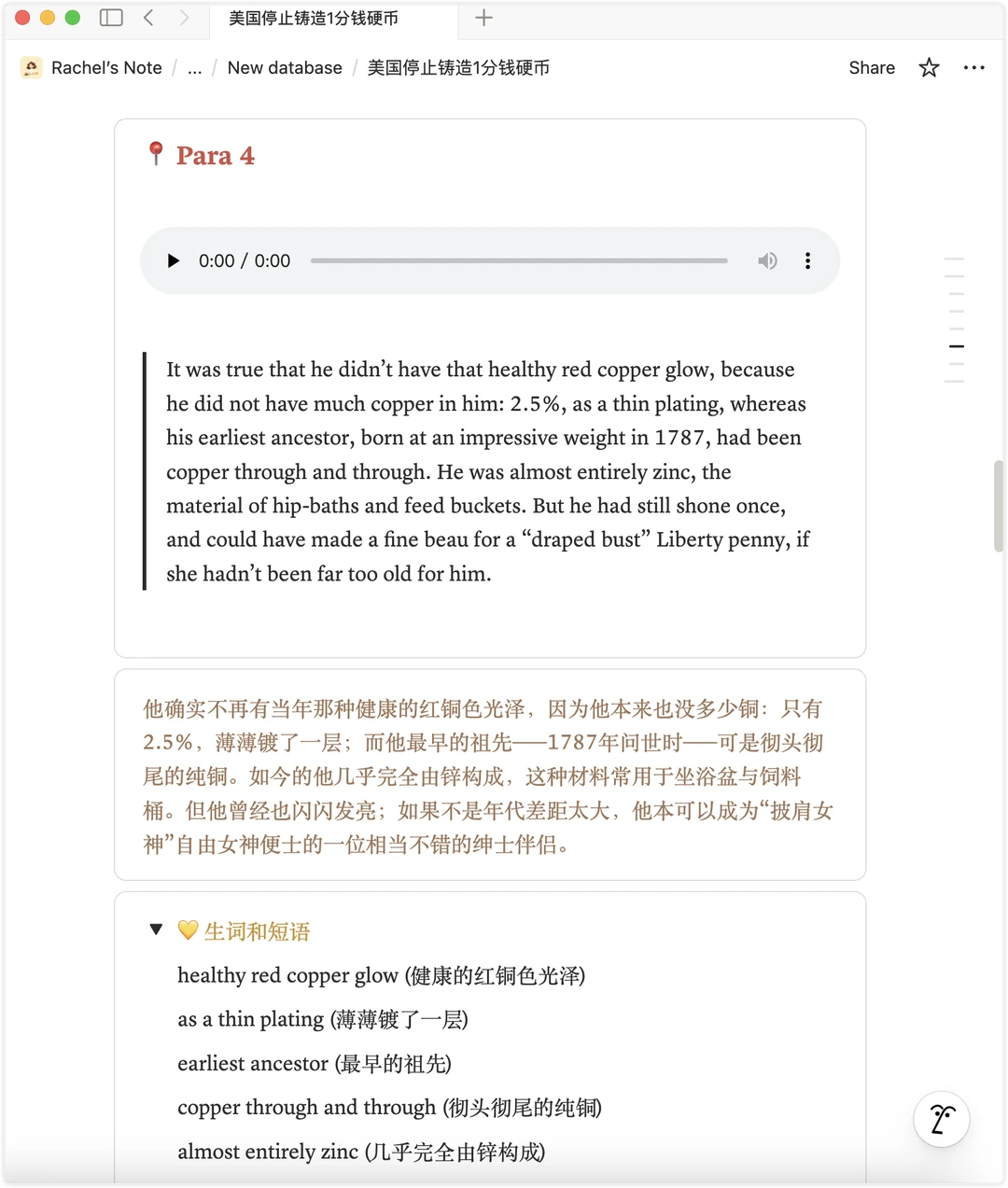 In the corner, a small tarnished copper coin lay forgotten—copper through and through (彻头彻尾的纯铜) despite years of oxidation.