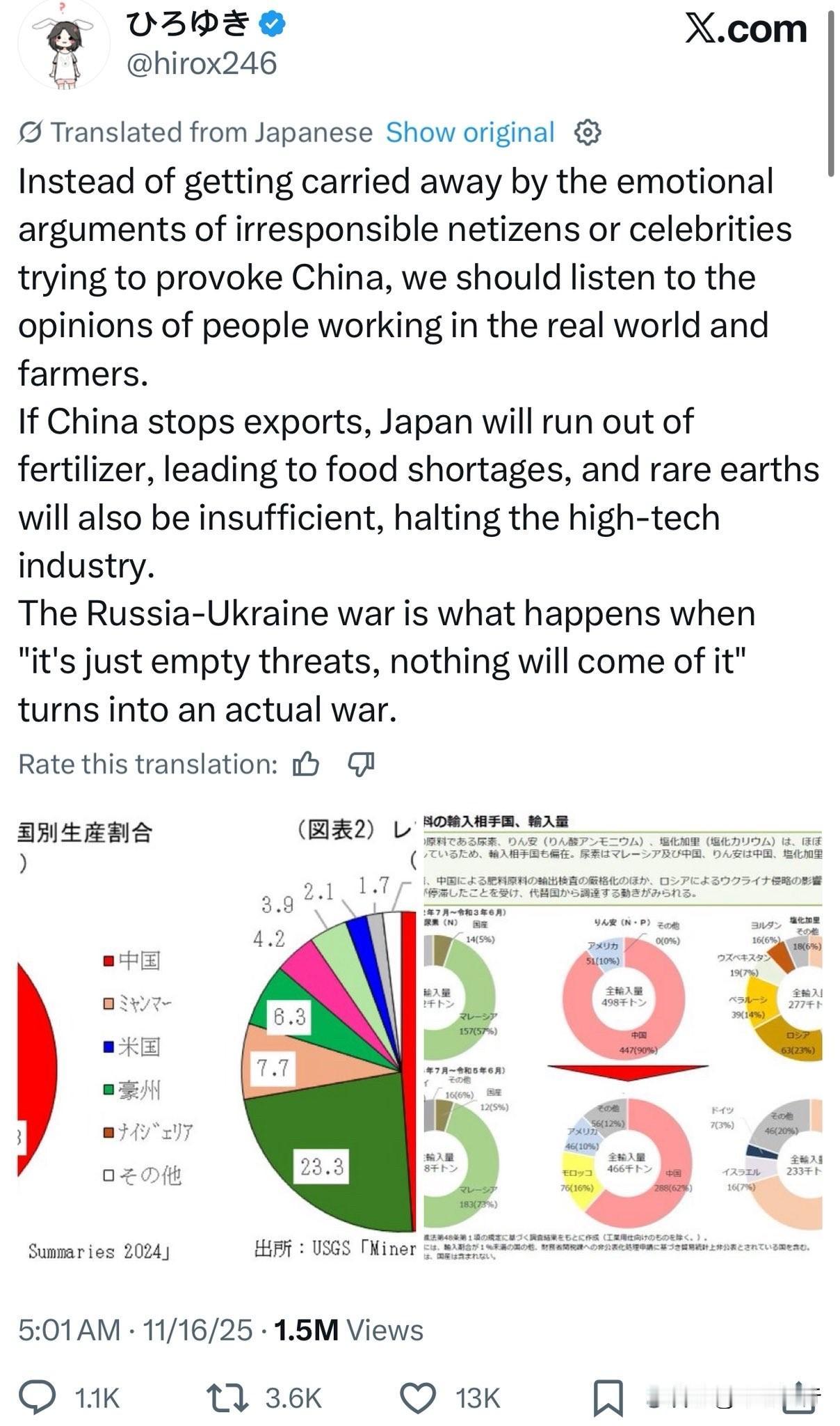 最近一位日本博主说了句大实话:别被各种反华煽动带着跑,日本很多关键命脉——化肥、稀土、材料——都离不开中国。真要断供,不光粮食吃紧,高科技产业也会瞬间熄火。 这种风险不是危言耸听,俄乌就是前车之鉴:从“嘴炮”到真冲突,中间往往只差情绪失控。 而另一边,首相正忙着跟三大经济团体谈“强化供给结构”“促加薪”。 社会在担心外部风险,政府在拼经济韧性。 日本现在的状态就是:一手防火,一手稳楼。🔥🧯