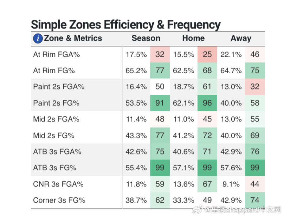 其实很多人对里德·谢泼德的观测时间并不深…1. 自主进攻能力这里给出一个大学时期的受助攻和自主进攻的投篮热图看下…斜坡三分接球投的比率相对大一些但是一旦持球进入了三分线内..中距离的区域是他自主进攻最灵活和活跃的区域…先不考虑篮下 毕竟ncaa和nba篮下对比差异太大..2. 大心脏射手,稳定性如图2可以看到 主客场无论是出手数比率还是命中率,这两项波动都不大..和赛季均值都很接近3. 高阶上极其高效率里德当时的肯塔基并不是一支强队但是里德Per值有23.6进攻效率129.4(很高)Dbpm 5Bpm 11.4ts 69.9%而使用率仅仅18%这说明里德并非是单一的射手,他能攻防两端都有一定的高效表现,但作为持球手确实需要进一步时间来培养…这类球员… 深受数据分析者喜爱…我举个例子 在espn kevin pelton的 WARP 模型中(感兴趣的自己查下,我说太多很多人可能听不懂,这个模型参数有年龄,胜利贡献,而且带有预测性,就是也许不会是当下最合理的排名,会加入球员成长因素,就是比如3年后排名靠前的成长会更快)谢泼德是当时2024 draft的状元秀候选人…(如图3)图中也给出了非模型下espn选秀排名,当时斜坡排第4(这里选秀前,有人当时会说为什么espn把斜坡排到第一了? 因为espn不同专栏作者给出的算法排名不同….givony是参考经纪公司反馈的综合排名,pelton是模型预测,还有espn的其他的比如big board排名等等)其实就是现在… 很多人对斜坡的了解还是不够深入… 慢慢来后续会带来更多的故事和分析让大家能更全面的了解…