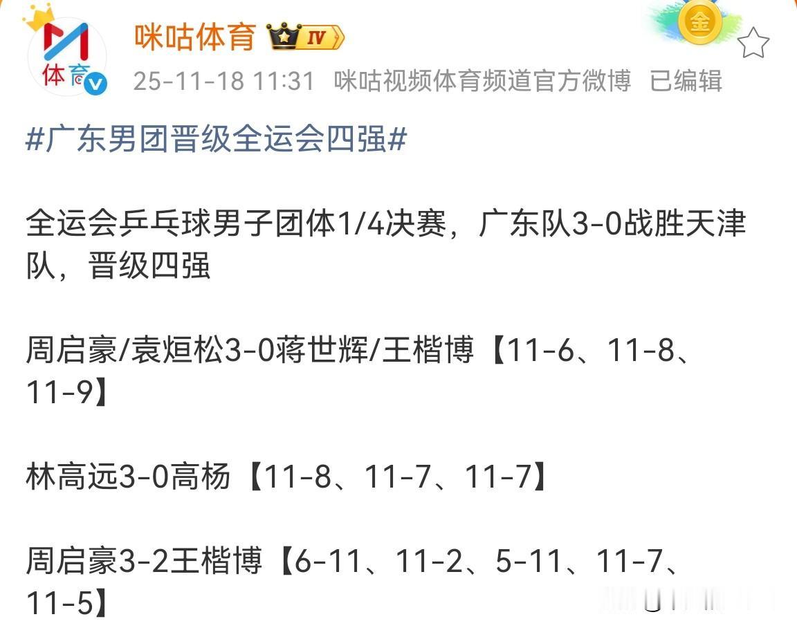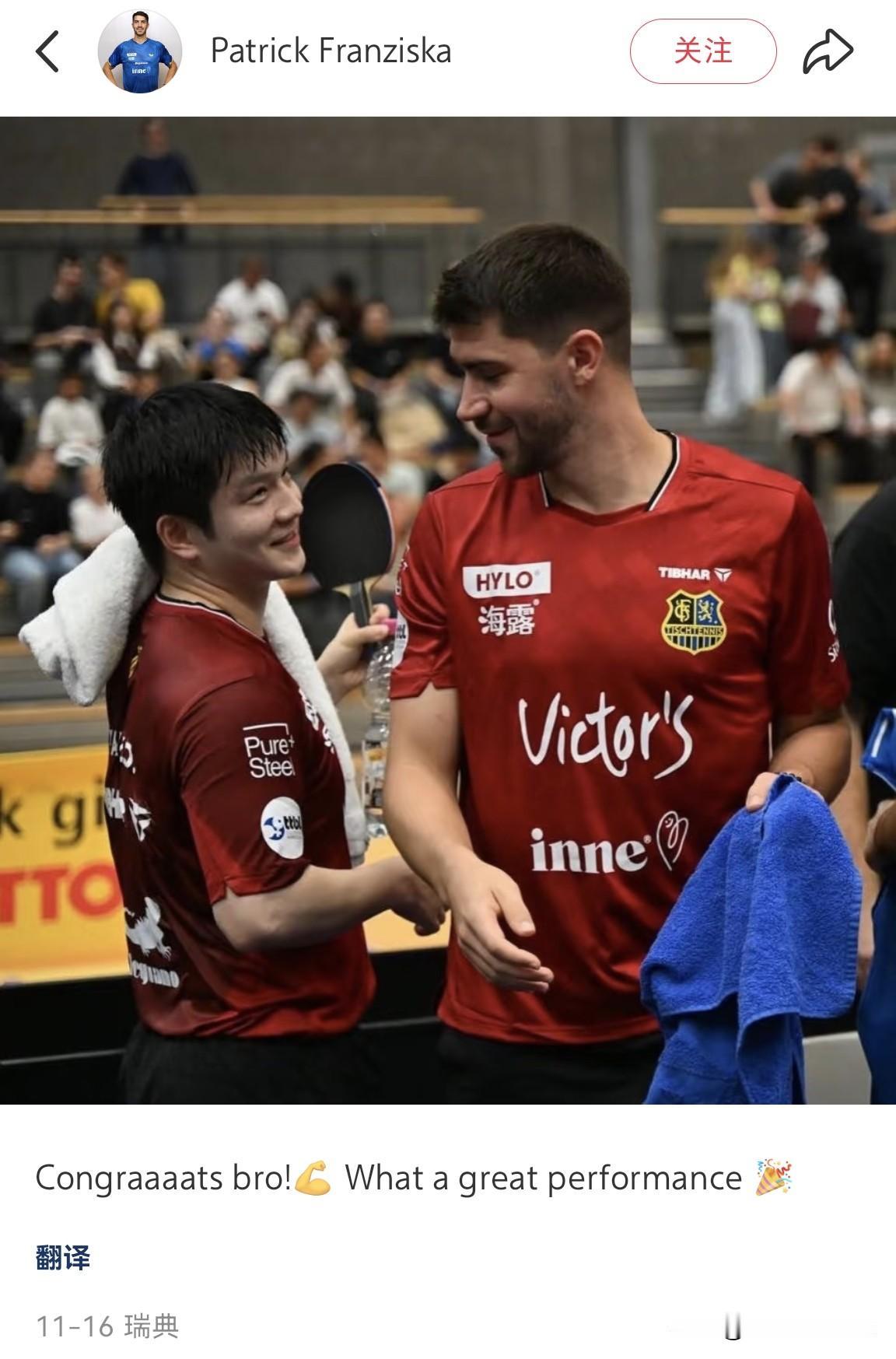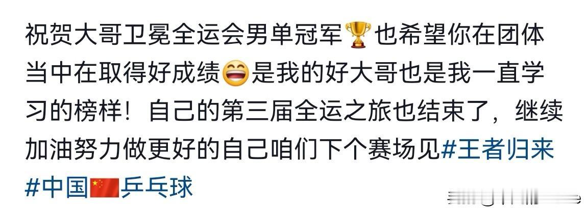11月18日,乒乓球运动员高杨发文说:“祝贺大哥卫冕全运会男单冠军,也希望你在团体当中在取得好成绩。” 高杨还提到:“樊正东是他的好大哥,也是他一直学习的榜样!自己的第三届全运之旅也结束了,继续加油努力做更好的自己,咱们下个赛场见。” 高杨还发了两张和樊振东的合照,两人都笑的好开心。高杨曾在比赛胜利后,模仿樊振东的庆祝动作,这就是偶像的力量。 高杨是天津队乒乓球运动员,在今天的乒乓球团体赛中,广东队以3-0战胜天津队,天津队遗憾止步团体8强。 除了高杨以外,德国运动员帕特里克·弗朗西斯卡(Patrick Franziska)也在国内社交平台发文恭喜冬冬夺冠,樊振东人缘真好。