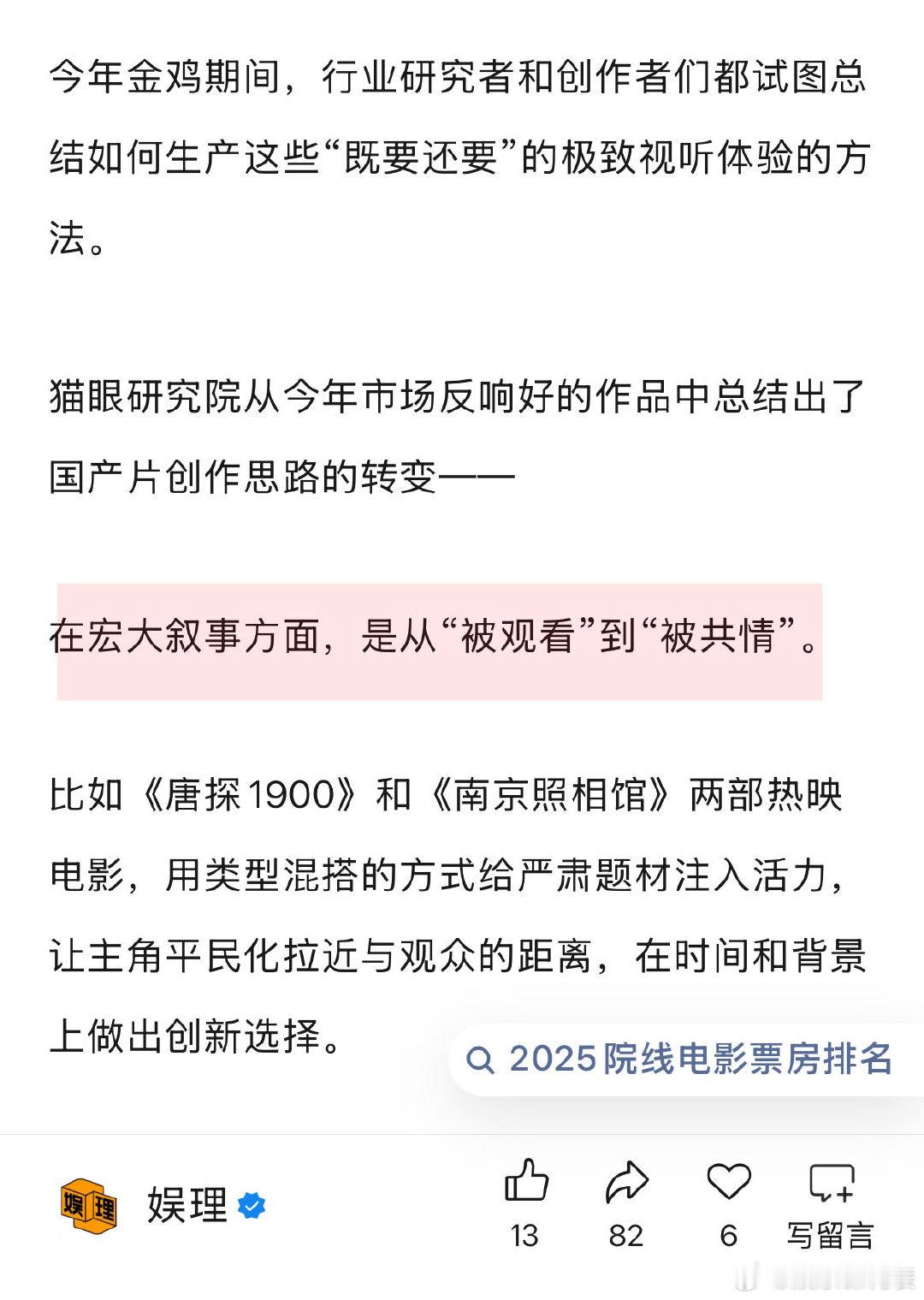 猫眼研究院从今年市场反响好的作品中总结出了国产片创作思路的转变:在宏大叙事方面,是从“被观看”到“被共情”,比如《唐探1900》《南京照相馆》都是用类型混搭的方式给严肃题材注入活力。传统类型方面则是在旧内容中找新切口,以新视角包装经典,比如《捕风捉影》《浪浪山小妖怪》,都是在注入“当下性”,在视听层面做到差异化…↓