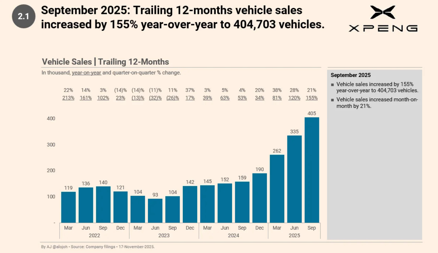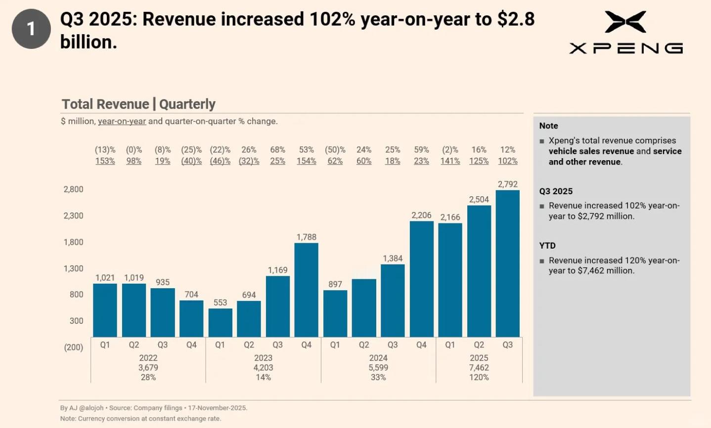 小鹏Q3财报出炉,营收203.8亿元,同比翻倍增长102%;交付11.6万辆,同比暴涨149.3%,首次进入新能源第一梯队。但亮眼数据背后,也有现实:仍亏3.8亿元,虽然是上市以来最小亏损,但距离真正盈利还差临门一脚。过去12个月,小鹏累计售出40.47万辆车,创历史新高,但必须看到:创新尚未完全成功,盈利能力仍需证明。规模增长只是第一步,把钱赚回来才是新能源车企真正的胜负手。何小鹏在最新会议上表示,公司正转型为“全球具身智能公司”,押注Robotaxi、人形机器人等前沿技术。Q3研发投入24.3亿元,同比增长48.7%,钱确实花在了未来。至于这条路能不能走通,就看下一次爆款和AI业务的兑现速度了。