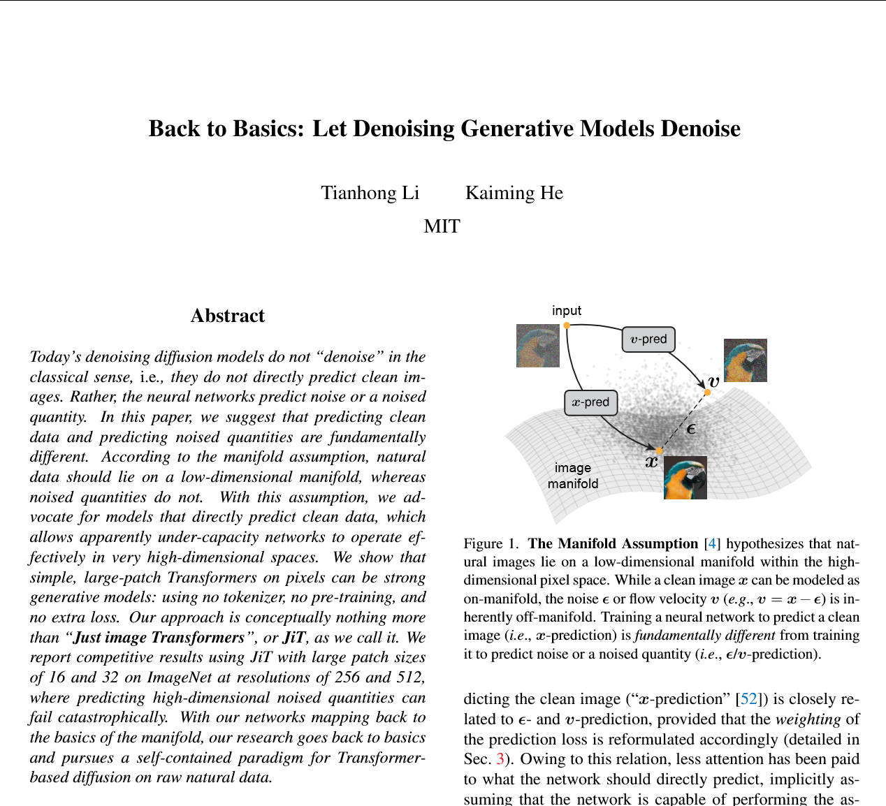 AI大佬何凯明、黎天鸿发新论文了!回归本源:让降噪生成模型(真正)降噪arxiv.org/abs/2511.13720----------------附带下AI解读:当你看到一个由AI生成的精美图像时,它很可能是通过“扩散模型”制作的。这个过程很有趣,它不是一步到位,而是从一张“纯噪音”(像电视雪花)的图像开始,然后“逐步降噪”,直到清晰的图像浮现。训练模型时,主流的方法是这样做的:1️⃣拿一张清晰的图像(我们称之为 x)。2️⃣往上面添加一定量的随机噪音(我们称之为 epsilon)。3️⃣得到一张“带噪音的”图像(我们称之为 z_t)。4️⃣然后,要求神经网络(模型)来预测它刚刚被添加的那个“噪音 epsilon”。这个方法在技术上被称为 epsilon-prediction(噪音预测)。还有一个类似的主流方法叫 v-prediction(速度预测),它预测的是一个混合了清晰图像和噪音的量。关键点是:在这些主流模型中,神经网络的直接输出目标不是那张清晰的图像 x,而是 epsilon 或 v。但这篇论文站出来说:等一等,这种做法(预测噪音)虽然很流行,但它可能从根本上就是错的,或者说至少是低效的。作者的理由基于一个在机器学习领域很经典的理论——“流形假设”(Manifold Assumption)。什么是“流形”? 你可以把“所有可能的像素组合”想象成一个极其巨大的、高维度的空间(比如一个 256x256 图像就有 256x256x3 = 196,608 维)。 清晰的图像:在所有这些可能性中,那些“有意义的、看起来自然的”图像(比如一张猫的照片、一张人脸)只占了这个巨大空间中一个非常非常小的、具有特定结构的部分。这个“小而有结构”的部分,就被称为“低维流形”。 噪音:而“噪音”的特性是完全随机、无结构的。它不位于这个“流形”上,而是散布在整个巨大的高维空间中。基于这个理论,作者的逻辑变得非常清晰: 预测噪音(主流做法)是困难的:你让一个神经网络去预测一个遍布于整个“高维空间”的、无结构的“噪音”(epsilon)。这要求网络具有极高的“容量”(capacity)来记住和处理所有这些高维信息。 预测清晰图像(作者提倡的做法)是更简单的:你让神经网络直接预测那张“清晰的图像”(x)。因为 x 位于那个“低维流形”上,它的目标是结构化的、维度更低的。网络只需要学会如何从带噪的输入中“过滤掉”噪音,保留那些位于流形上的低维信息。因此,论文倡导,模型应该“回归本源”,直接执行“降噪”这个词的本意:直接预测那张清晰的图像。这个方法在论文中被称为 x-prediction。总结一下:作者认为,让模型去学习预测一个高维、无结构的“噪音”目标,是一种“舍近求远”的低效做法。而让模型回归到预测那个低维、有结构的“清晰图像”目标,在理论上更合理,在实践中(尤其是在处理高维像素数据时)更有效。