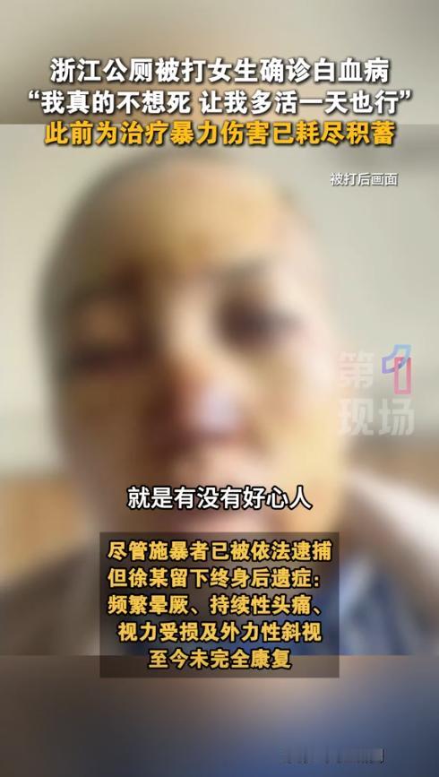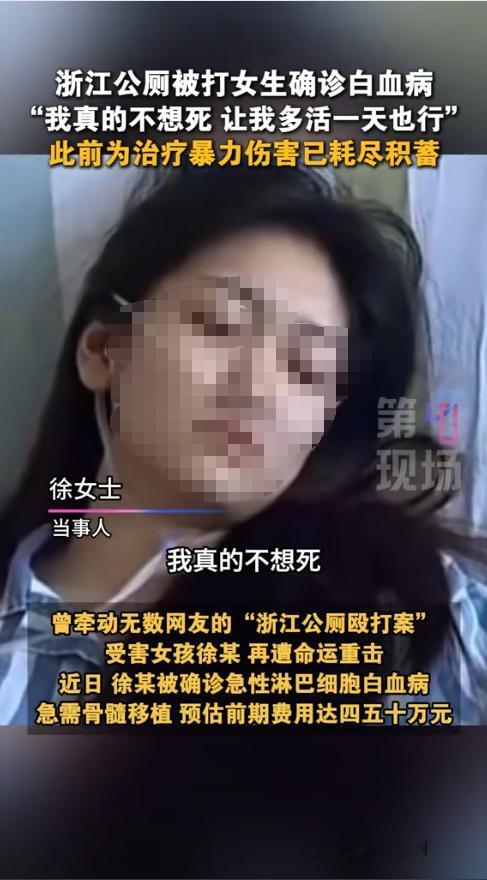 浙江永康,女子走进一个公厕,尾随着一个陌生男子,女子发现了想赶紧出去,结果被男子殴打了20多分钟,导致头部,眼部,舌头多处受伤,为了疗伤,他们家花光了积蓄,如今,不幸又袭来,她患上了白血病。 那天徐女士出门时身体有些不舒服,路过一处公共厕所,就想着进去方便一下。她当时没多想,也没留意到身后跟着一个陌生的壮年男人。等她察觉到不对劲,想赶紧转身往外走的时候,已经来不及了。那个男人直接堵住了公厕的出口,二话不说就对她动了手。 接下来的二十多分钟,对徐女士来说简直是一场漫长的噩梦。男人的殴打没有任何征兆,也没有停歇,拳头和脚不断落在她身上,头部、眼部、舌头都受了重伤。 她拼命反抗、呼救,可公厕里空无一人,根本没人能听到她的声音。直到男人发泄完离开,她才勉强撑着满身伤痕,挣扎着联系家人求救。 后来经过法律鉴定,徐女士的伤势被定为“轻伤二级”,可这简单的五个字,根本道不尽她承受的痛苦。 为了治疗这些外伤,缝针、检查、康复,家里前前后后花光了所有积蓄。徐女士的家庭条件本就不好,父亲早就身患重病,失去了劳动能力,母亲也因为身体原因没法工作,家里的重担一直压在她和还在读初中的弟弟身上。 她是家里重要的经济支柱,靠着自己的小生意勉强维持着一家人的生计,可这场突如其来的暴行,不仅让她的身体受了重伤,还直接掏空了家里的全部积蓄。 受伤后的很长一段时间,徐女士都没法正常工作。头部的伤让她时常头晕,眼部的损伤影响了视力,舌头的伤口愈合后也留下了后遗症,更严重的是心里的阴影,从那以后,她再也不敢独自去人少的地方,晚上经常做噩梦,精神状态一直很差。 家里没了稳定的收入,还要负担她后续的复查费用,日子过得一天比一天紧巴,可即便如此,徐女士和家人还是咬牙坚持着,想着等身体慢慢好起来,总能把日子过回去。 可命运的打击来得猝不及防。就在前不久,徐女士因为身体持续不适去医院检查,一张白血病的确诊书,彻底击碎了她所有的希望。拿到结果的那一刻,她和家人都懵了,怎么也不敢相信,这样的重病会落在她身上。 可现实容不得他们逃避,医生说需要尽快治疗,可治疗费用对这个早已一贫如洗的家庭来说,无疑是一个天文数字。 两年前的那场暴行,已经花光了家里所有的积蓄,现在家里不仅没什么存款,还因为之前的治疗欠了一些外债。 父亲的病需要长期吃药,母亲身体不好也需要照顾,弟弟还在上学,全家能指望的只有徐女士,可现在她自己成了重病患者,连自理都成了问题,更别说赚钱养家了。 他们也想过通过法律途径争取赔偿,知道《民法典》里规定可以要求精神损害赔偿,可诉讼流程漫长,赔偿金额也不确定,远水解不了近渴。 现在徐女士每天都在和病魔抗争,每一分每一秒都很宝贵,她需要尽快筹钱治疗,可家里实在是拿不出任何多余的钱了。 徐女士常常忍不住想,如果两年前没有那场突如其来的殴打,如果家里的积蓄没有被掏空,现在她是不是还有钱去治疗白血病,是不是还有机会好好活下去。这样的念头一次次刺痛着她,也让她的家人陷入了深深的自责和无力。 他们四处向亲戚朋友借钱,可大家的条件都有限,能帮的也只是杯水车薪。 如今,徐女士只能躺在病床上,看着家人为了医药费奔波操劳,心里又着急又心疼。她才二十多岁,人生还没真正开始,就接连遭遇这样的重创。 对她和她的家庭来说,两年前的那场二十多分钟的暴行,不仅带来了身体上的永久伤害,更彻底摧毁了家庭的经济基础,让他们失去了抵御风险的能力。而现在的白血病,就像压垮骆驼的最后一根稻草,让这个本就风雨飘摇的家,几乎走到了崩溃的边缘。 身边的人知道了徐女士的遭遇后,都觉得很心疼,也有人主动伸出援手,帮着转发求助信息。大家都希望能有更多好心人看到,能帮这个年轻的姑娘一把,让她有机会继续治疗,有机会重新站起来。毕竟,她只是一个普通的女孩,不该因为一场无妄之灾,就失去活下去的希望。 信息来源:第一现场