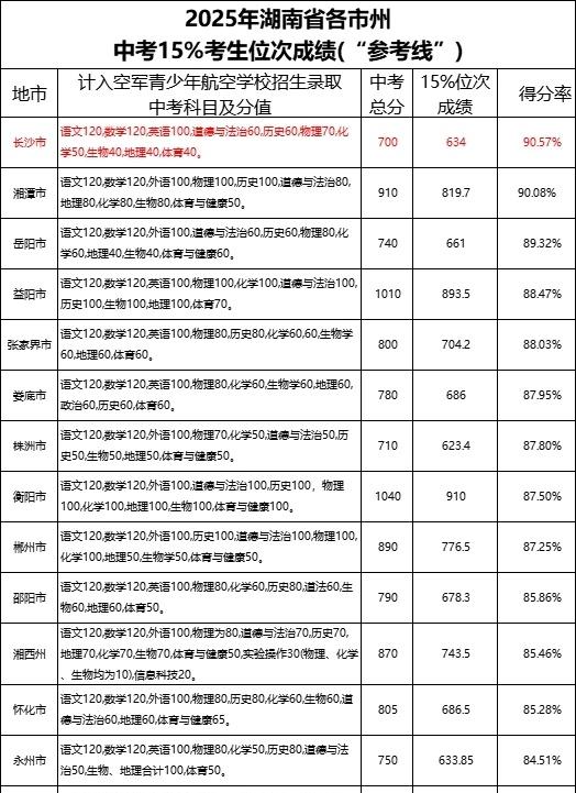 湖南十四市15%优生中考成绩大比拼! 湖南省航空军校招生简章中有一份“湖南各市州中考15%考生位次成绩”参考表,从此表我们可以看下湖南十四市优秀学生成绩情况✅ 🥇长沙634分(得分率90.57%)稳居第一,湘潭819.7 分(90.08%)紧随其后,其余地市均在90%以下 ⚠️注意:长沙中考是单独命题,但其他13个市州用的是同一套中考卷,但科目分值差异大!得分率不一! 📌地理、生物易拿高分甚至满分,假设部分地区这些科目的分值占较高,那总分和得分率就会被拉高;反之数学、语文权重高的城市,得分率反而吃亏 📌图中数据含城区+县市,例如长沙优质资源集中在城区,城区优生得分率更亮眼,2025年长沙地区前15%实际分数641分,比表中还高!