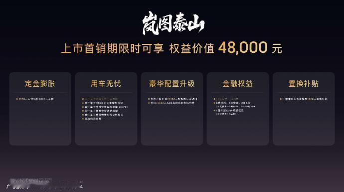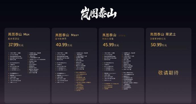 37.99-50.99万的岚图泰山能比极氪9X香吗? 岚图泰山 基础参数:5230*2025*1817mm,轴距:3120mm(中大型SUV) 驱动形式:插混+四驱 布局:2+2+2 发动机:1.5T/95号汽油 发动机功率:110kW 电机功率:前150/后230kW 充电平台:800v+5C 零百加速:5.2-5.5s CLTC续航:350km 电池容量:65kWh 接近角/离去角:19/21° 轮胎尺寸:22寸 底盘悬架:前双叉臂后五连杆+三腔空悬+EDC 智驾系统:华为乾崑 ADS 4 智驾硬件:4*激光雷达/5*4D毫米波/12*超声波/11*摄像头 显示屏:10.25仪表屏+16.1中控屏+21.4后排娱乐屏+55 AR-HUD+二排3.5扶手屏 座舱系统:鸿蒙座舱 5 外观颜色:黑/蓝/金/紫/灰/金紫 内饰颜色:黑棕/棕米/黑红 座椅:AI云舒座椅/六座通风加热/前排+二排按摩/二排双零重力座椅/二排小桌板 其他配置:标配9气囊/26和32扬声器/双50w无线充 37.99万 Max 华为ADS 4/1*激光雷达/26扬/后排娱乐屏/13L冷暖冰箱 40.99万 Max+ 三腔空悬+后轮双16°转向/32扬/AI座椅/二排零重力座椅 百万投影大灯/电踏板/二排私隐帘/3.5扶手屏/主动降噪 45.99万 Ultra 4*激光雷达/光瀑格栅/智能隐私玻璃 黑武士版 全黑套件/黑格栅/22寸黑锻造轮毂/红色卡钳 专属门板/座椅/星空顶 上市礼: 5000抵扣8000元 三电终身质保+免费道路救援(首任车主) 50%首付,三年0息 5000元置换补贴 20000元感应电动门(送) 选装: 流光星辰把手 5000 鎏金紫/玄墨金 10000 天地之镜轮毂 10000 教授觉得岚图泰山还是很有竞争力的,首先即使低配也有350km纯电续航+座椅等等各种权益了,再给3万就有后轮转向+32扬+一堆豪华配置,可以说要是不要4激光雷达的版本,40.99万就是最佳配置了。需要顶级接近L3的智驾,俺就是45.99万的配置,可以说岚图这40-50万之间的配置还是很有竞争力的。比较尴尬的是一众40万+的大六座SUV,似乎整体参数不如岚图了。空间来说,岚图泰山还要比9X还要强一些,你们觉得岚图泰山比得上9X吗?【来自懂车帝车友圈】