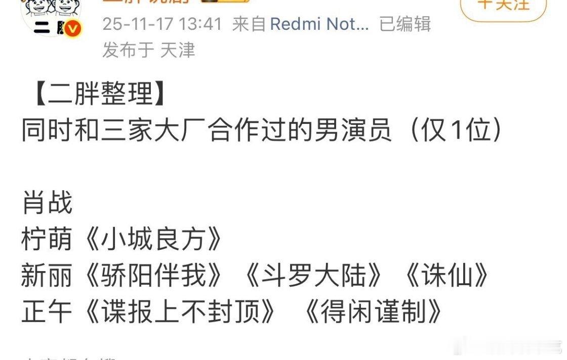 肖战是唯一一位同时和三大厂合作过的男演员!不深度捆绑与每个公司每个平台都是平等合作关系这才是最健康最优秀的,要做到这点其实很难,做到的同时拿到好的班底更难,肖战都做到了。