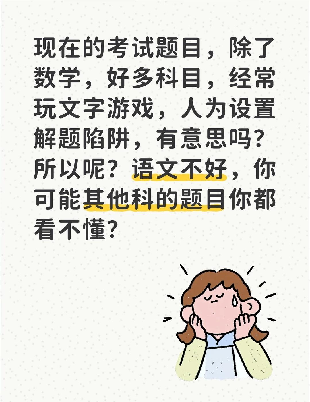 现在的考试题目,除了数学,好多科目,经常玩文字游戏,人为设置解题陷阱,有意思吗? 所以呢?语文不好,你可能其他科的题目你都看不懂?教育 中考语文 考试技巧 学霸 考试 数学