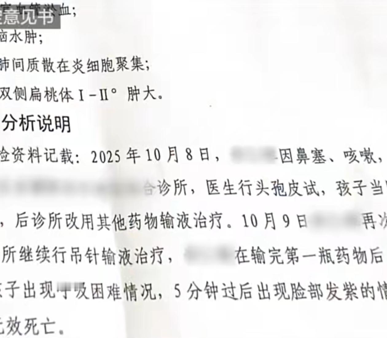 11月18日,湖南湘潭市民黄女士向媒体反映,其10岁儿子在诊所输液期间不幸离世。据黄女士陈述,10月8日,其子因轻微哮喘前往该诊所接受输液治疗,因存在头孢过敏情况,医护人员为其更换药物;10月9日,男童再次到该诊所输液,在输完第一瓶药物后出现身体不适症状,随后不幸死亡。 该诊所负责人回应称,事件发生后,诊所已暂停营业,正全力配合相关部门开展调查工作。尸检报告结论显示,男童死因系过敏性休克。 记者从湘潭市岳塘区卫生健康局获悉,目前卫健部门已对该起事件正式立案,相关调查工作正在深入推进中。