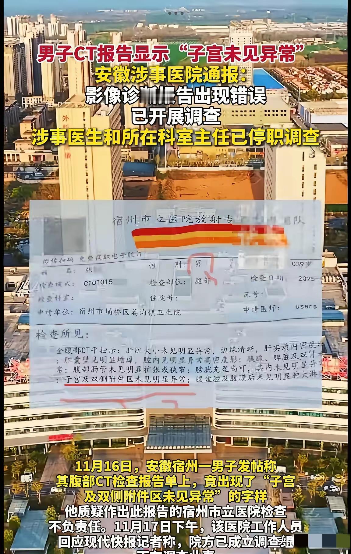 “太荒唐了!”安徽宿州,一男子到医院看病,拿到ct报告单后,一下子傻眼了,不是被病情吓到了,而是报告结果赫然写着:“子 宫及双侧附件未见明显异常。”男子当即认为这份报告有假,气得当场找医院讨 说法! 别拿“模板没改”当借口,CT报告要过书写、审核、复核三道关,连性别都能错,分明是流程形同虚设,责任心严重缺位。患者花几百块是来明确病因的,不是来收“搞笑报告”的,这种错误让整个检查结果都失去可信度。 医疗无小事,每一个字都关乎健康甚至生命。停职调查只是开始,更该补的是流程漏洞和责任意识。医院的严谨,才是患者最该有的“定心丸”。 你遇到过医疗相关的小失误吗?如果拿到这样的报告,你第一反应会是什么?