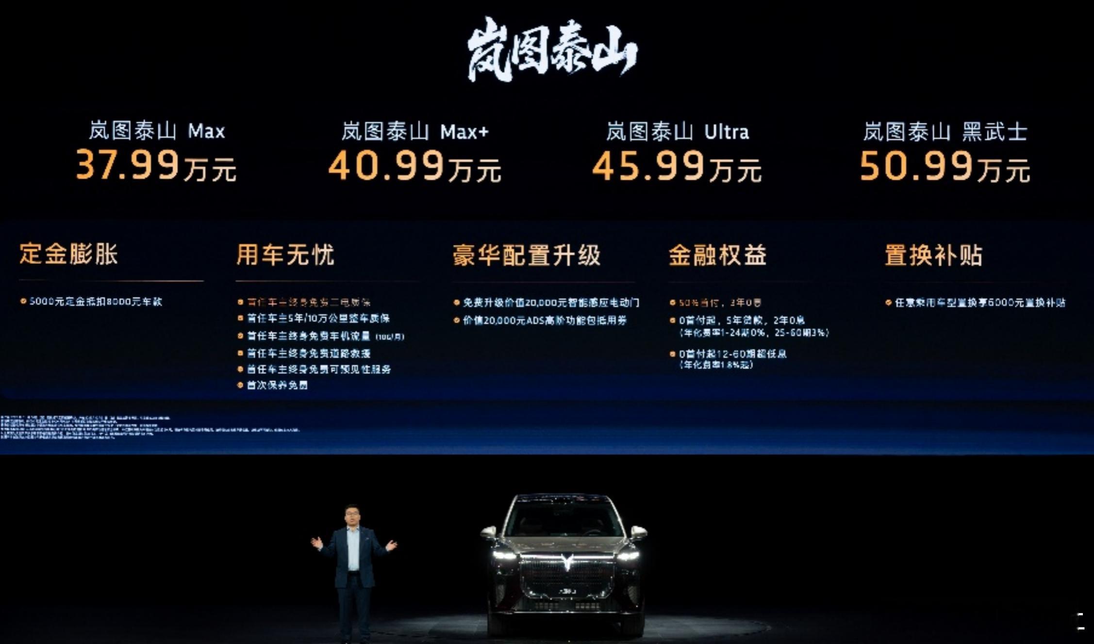岚图汽车全新旗舰SUV岚图泰山在深圳国际会展中心正式上市新车共推出Max版、Max+版、Ultra版、黑武士版四版官方指导价区间为37.99万元至50.99万元新车搭载了国内首款三腔空气悬挂、800V岚海智能超混系统、双向16°后轮转向等百万级机械素质配置,并全面搭载了华为乾崑智驾 ADS 4与鸿蒙座舱5,以最强底盘、最强三电、最强智驾的价值“铁三角”。这台新华系旗舰,大家觉得怎么样
