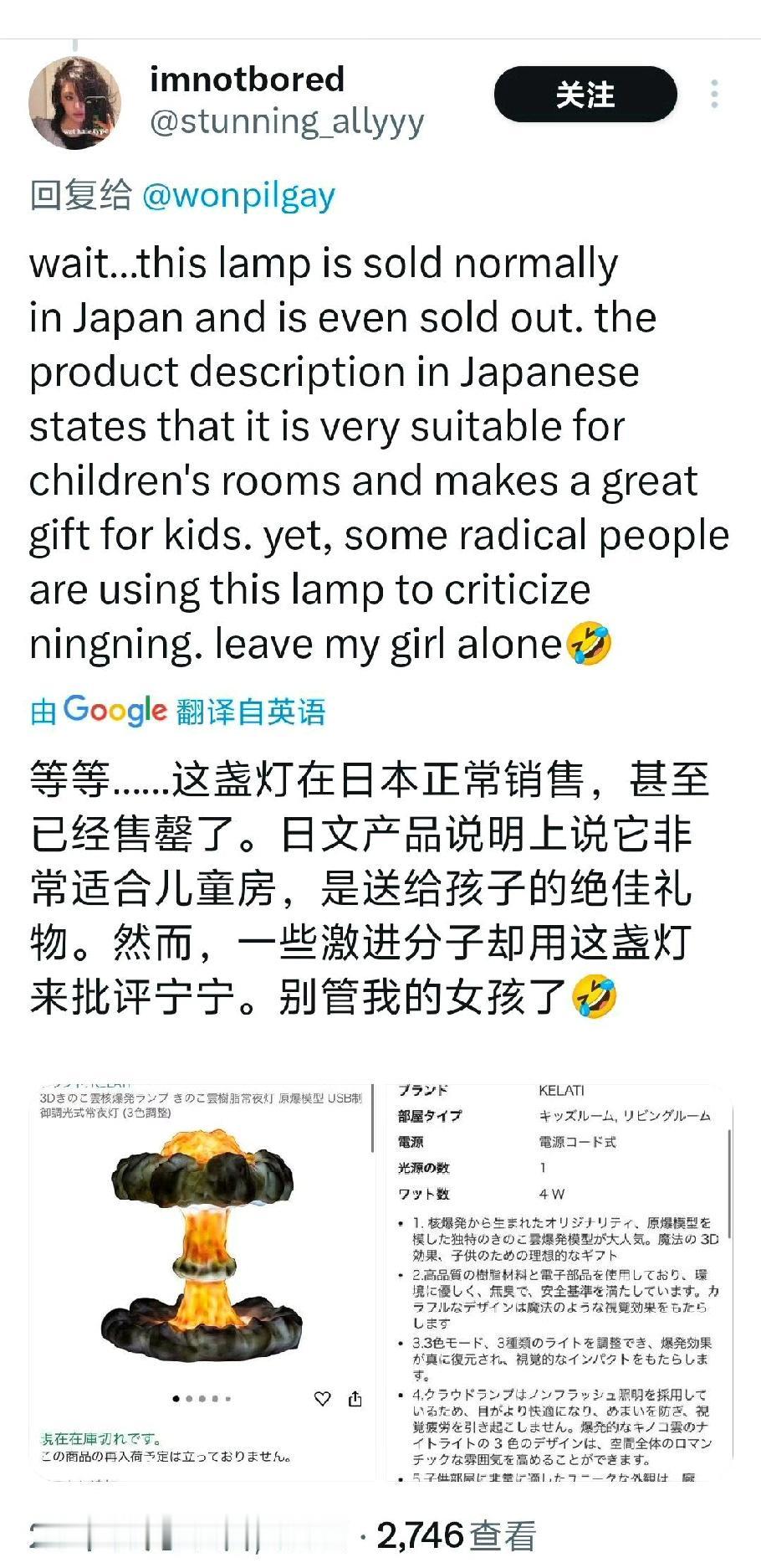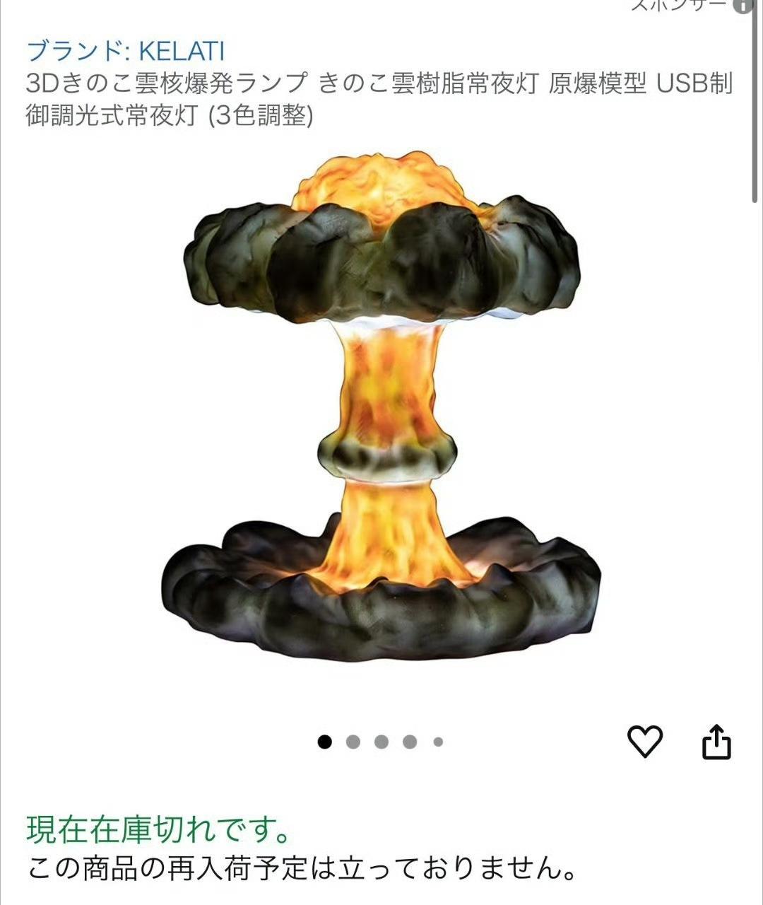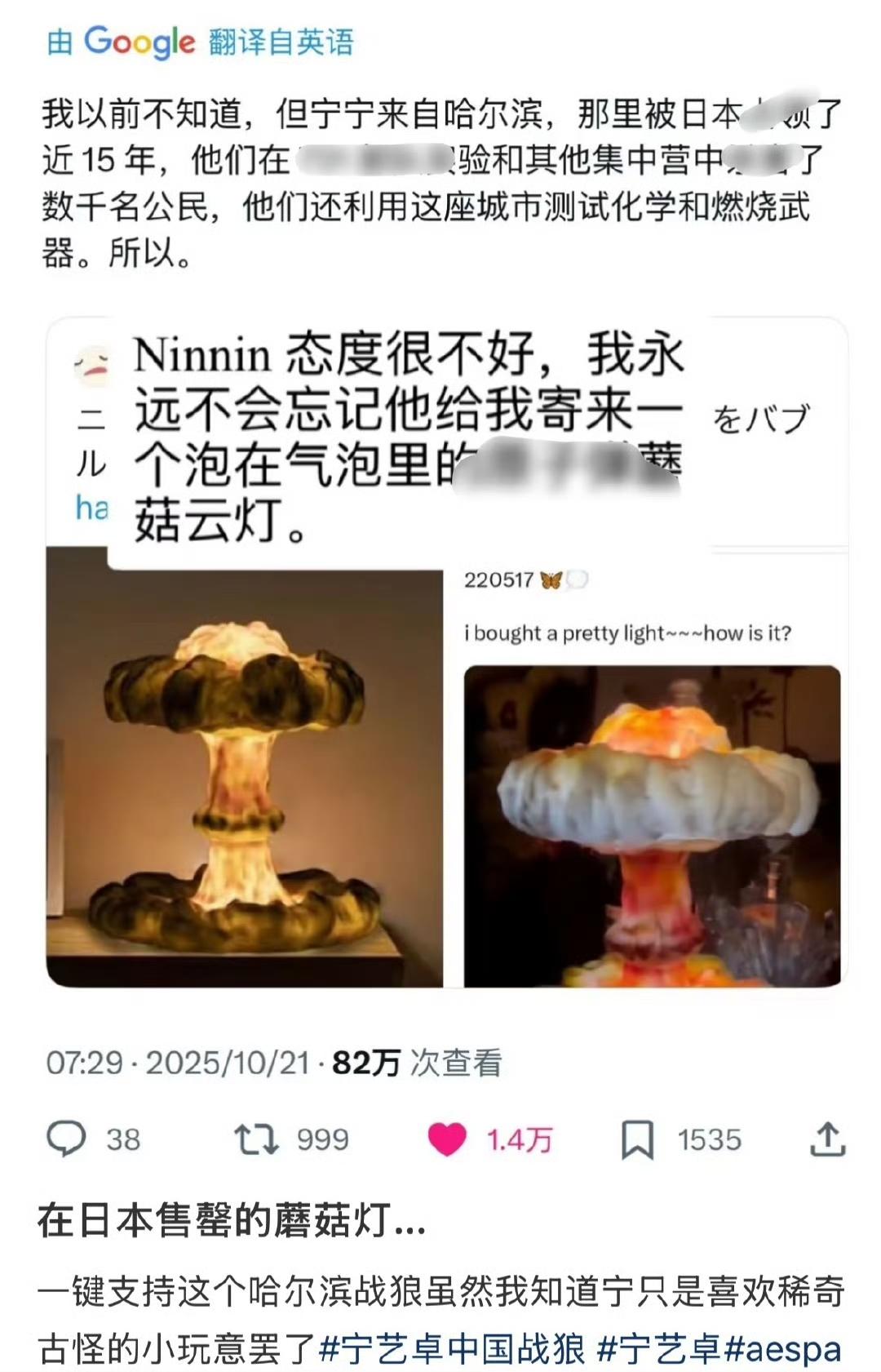 做贼心虚了是吧?说明他们自己清楚自己干了什么,所谓的不清楚历史都是骗人的。很多日本人从来没有想过这个灯是怎么来的,只会把问题怪到别的身上。 aespa已确定受邀参加12月31日直播的《第76届NHK红白歌合战》,但消息一出便因中日关系紧张以及成员宁宁(中国国籍)两年前的“原子弹蘑菇云造型台灯”旧帖被翻出而引爆日本舆论。 日本网友认为该灯具造型影射广岛、长崎原爆,是对历史悲剧的消费,遂在change.org发起联署,要求NHK将aespa撤下演出名单;截至11月18日下午,参与人数已突破5万。NHK方面尚未就是否更换出演者作出回应,事件仍在发酵。 敏感又玻璃心的日本人,这个灯还是你们自己人设计的,在你们那里都售罄了。还好这个女孩不是买的两个,买两个那你们不是更玻璃心破碎了?
