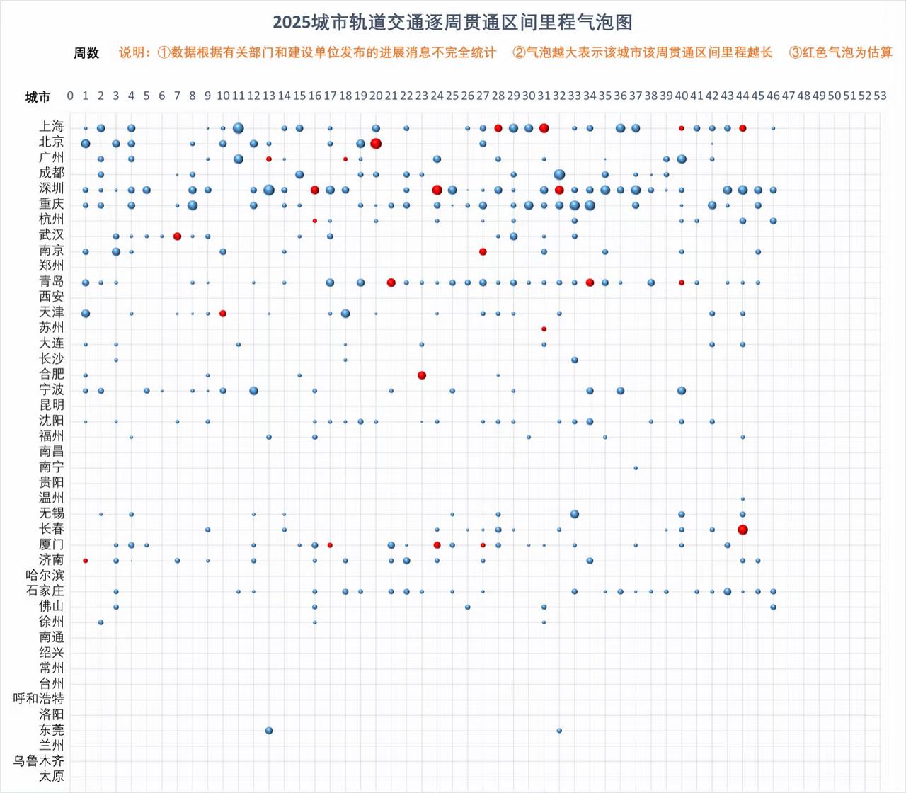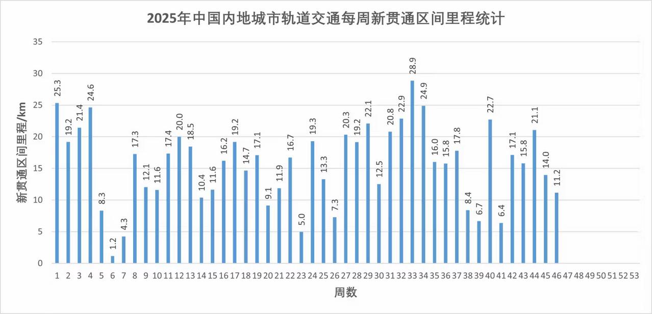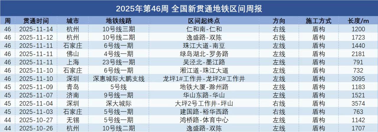 2025年第46周 全国新贯通地铁区间周报 本周全国新增贯通13个区间,总长度21.05km,继续保持高速。今年以来全国累计贯通区间里程已达717.20km。 本周重要节点包括: 1️⃣东莞地铁1号线一期通过竣工验收、安全评估 2️⃣沈阳地铁10号线二期首座车站封顶、首个区间盾构始发 地铁建设