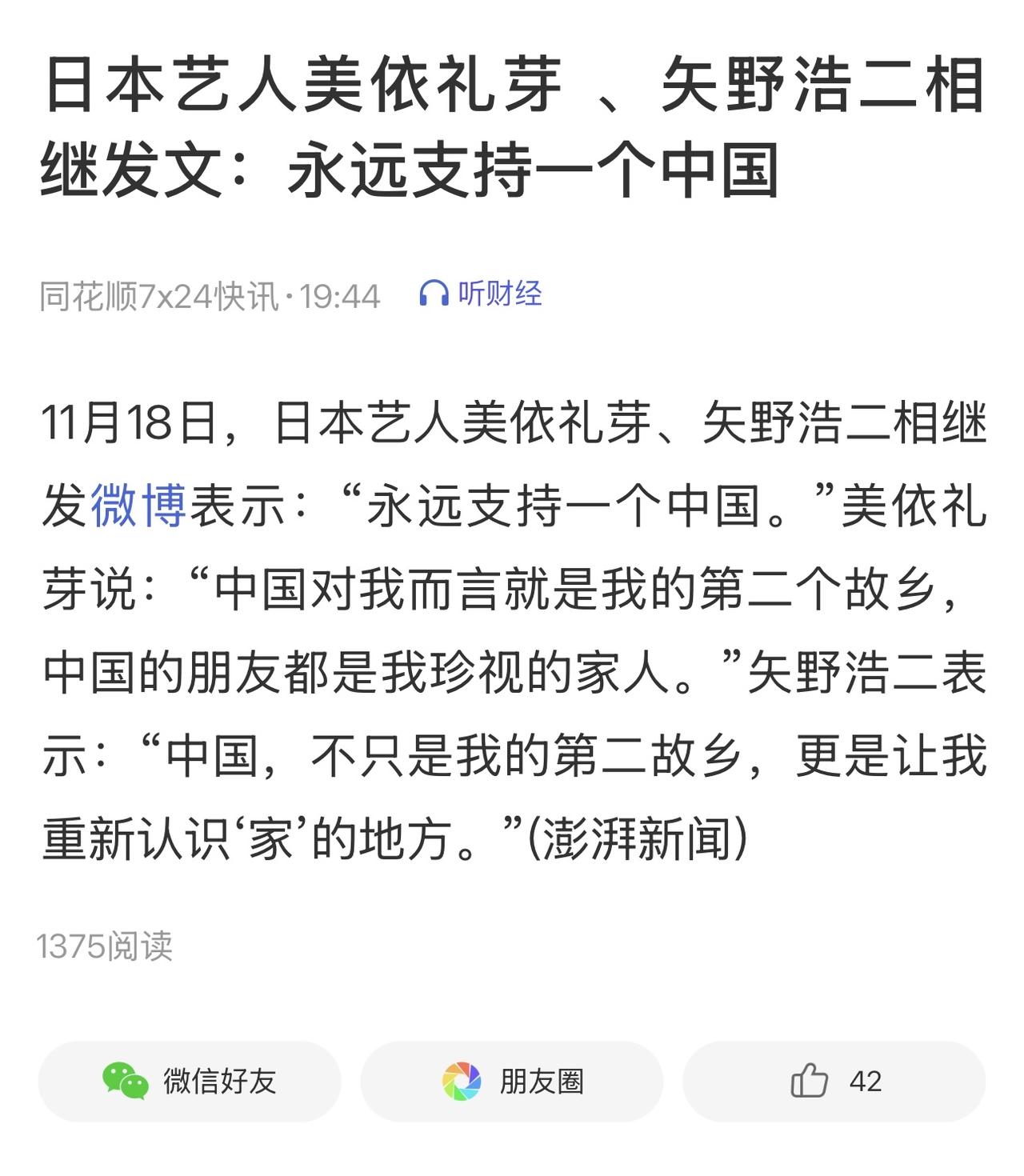 受当前中日关系紧张影响,日本男团J01在广州的粉丝见面会被主办方以“不可抗力”为由取消。 与此同时,曾登上中国湖南卫视综艺节目《乘风破浪的姐姐》的日本歌手美 依礼芽公开表示永远支持一个中国。 另一方面,已在中国成家的日籍演员矢野浩二表达了对中国的深厚感情,称中国让他重新认识了“家”,并明确表示“永远支持一个中国”。