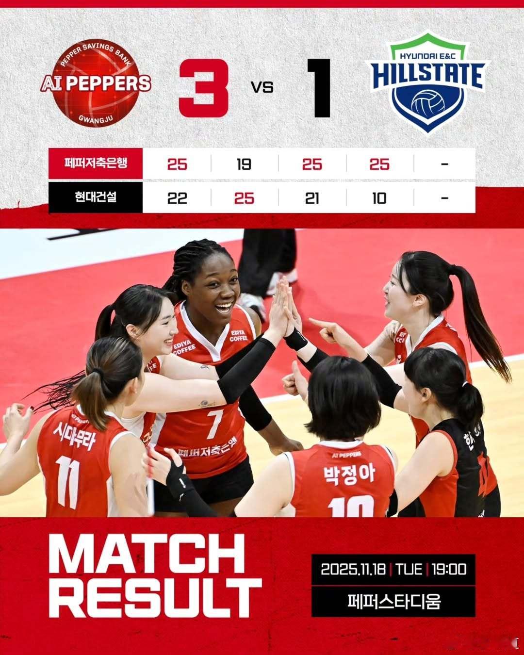 胡椒储蓄银行 3-1(25-22/19-25/25-21/25-10) 现代建设Pepper储蓄银行又赢了!主场5战全胜!目前6胜2负积16分紧追高速公路公社,现代建设遭遇4连败,其中第4局崩盘仅拿到10分,目前战绩为3胜5负暂列第四储蓄银行-现代进攻:66-46;拦网:6-7;发球:4-4;自失:21-18佐伊33分 56扣29中 1发3拦;高艺琳14分;岛村春世14分 22扣14中;鹅姐6分 20扣6中,朴恩淑4分,林珠恩3分,朴莎朗2分卡里19分 42扣16中 3拦;郑智允14分,梁孝真12分 23扣9中 1发2拦;贾斯蒂斯7分,金姬真2分,罗贤秀2分,徐智慧1分