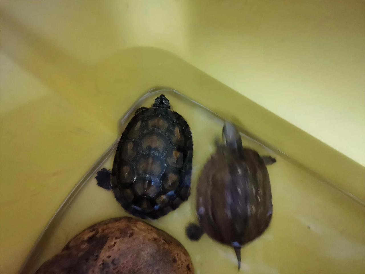 儿子养的两只龟有一段时间了,它们今天终于有了自己的名字,左边的叫当当,右边的叫叮叮,是儿子自己给它们取的名字,你们觉得好听吗? 我觉得挺好听的呢!现在,就是有一个担心,不知道叮叮当当能不能熬过冬天…… 今天的天气,突然降温,只有九度左右的气温,人都要穿棉袄了,叮叮当当开始不吃不喝,也没见它们睡觉,感觉情况有点不妥呀。 养过龟的人,一定知道如何让龟龟安全度过冬天吧?我们这里是在广东,你们说该怎样让龟龟过冬天,欢迎各位支招,谢谢!