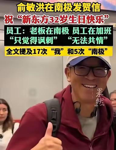 还是冯唐最理解俞敏洪, 不愧是麦肯锡管理出来的,太懂资本家和老板的心思了,他说:俞敏洪激励人的方式非常省钱。 ​这两天,俞敏洪南极旅游发全员信遭吐槽登上了热榜。11月16日,是新东方成立32周年庆,创始人俞敏洪人在南极给全体员工发了一封全员信。 ​可笑的是他的信没有让员工感到共鸣,却引来了吐槽,据他们员工透露:纪念日当天很多员工在完成当日工作后又连夜加班赶方案,老板却在南极给他们谈企鹅。 老板和员工所处角色位置不同,注定了都已经无法共情彼此,公司越成功,老板和员工差距越大越是如此!60%以上的公司没有能活过两年,老板和破产老赖就一线之差! 双向选择,老板亏钱倒闭半夜发愁的时候,也没要求员工起床一起发愁。为什么老板去旅游的时候,员工心理不平衡?如果老板这么好当,大家都别打工都去当老板好了。 很多旅行社已经开发了南极线,老俞应该是在宣传,别想没用的了,你要是买了他的票去南极旅游,回来后还感恩戴德地说物有所值,他就完成任务了,草根们真的别瞎用情了,去共情董宇辉吧,感悟一下他是如何突围的,草根们如何获得自己的利益活下去才是正确的事情。