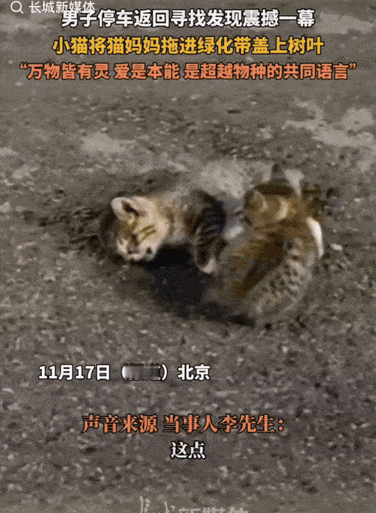 “万物皆有灵性!”北京,李先生深夜回家的时候,在路上碰到两只猫咪。大猫被撞死了,小猫守在大猫身边。李先生停好车,再走过去的时候,两只猫都不见了。 他听到绿化带里有猫叫。他走过去一看,大猫被移到了绿化带,并且身上盖了几片梧桐树叶,小猫依然守在身边。看到这一幕,李先生很感动。他觉得太神奇了,现在是深夜,路上几乎没有人。他就停个车的时间,大猫就被转移了,而且还盖上了树叶。(PS:李先生虽然没有看到,其实是一个遛狗的人,把大猫转移了并盖上了树叶。)他当即就决定收养小猫。 他回到家拿来猫粮和毯子,并带上爱人一起,把小猫带回家。他们找了一会儿,才找到小猫。小猫被李先生照顾得很好。 万物皆有灵性。爱是本能,爱是超越物种的语言。爱是冬日的暖阳,虽然寒冷,却带来温暖和希望。善良的李先生,就是小猫的暖阳,在寒冷的冬天给了它一个温暖的家。