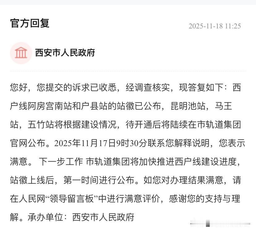 关于西安地铁西户线中间站站名标识的咨询。 您好!关于西安地铁西户线有一个问题想咨询下。 西安地铁每一站都有独特的站名标识,西户线目前只开通了阿房宫南和户县两站,中间的昆明池站,马王站,五竹站均未开通,并且因为暂未批复建设,马王和五竹站还很有可能不办理客运服务,所以感觉遥遥无期。询问过地铁内认识的工作人员,答复是这三站的标识很早就已经设计好。因为对于站名标识文化非常热爱,因此想在此咨询,请问这三站的站名标识何时可以公布? 官方回复 2025-11-18 11:25 西安市人民政府 您好,您提交的诉求已收悉,经调查核实,现答复如下:西户线阿房宫南站和户县站的站徽已公布,昆明池站,马王站,五竹站将根据建设情况,待开通后将陆续在市轨道集团官网公布。2025年11月17日9时30分联系您解释说明,您表示满意。 下一步工作 市轨道集团将加快推进西户线建设进度,站徽上线后,第一时间进行公布。