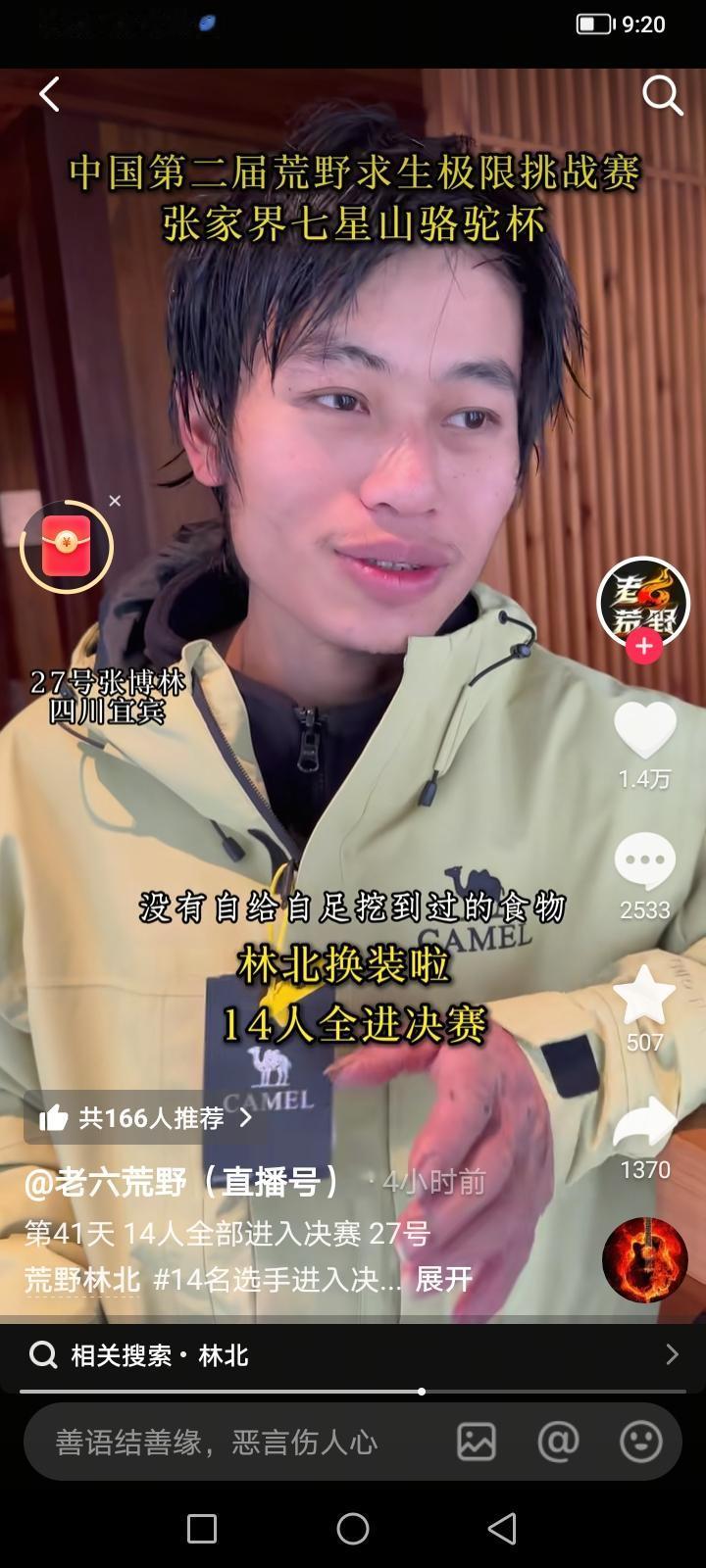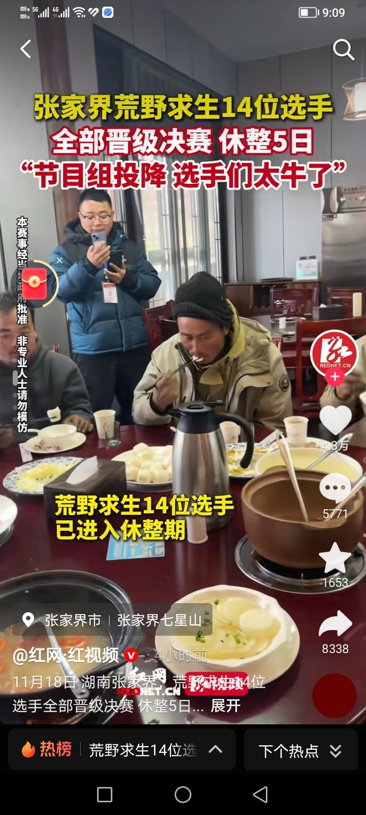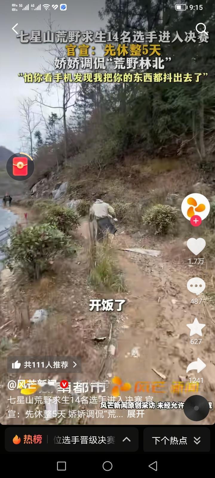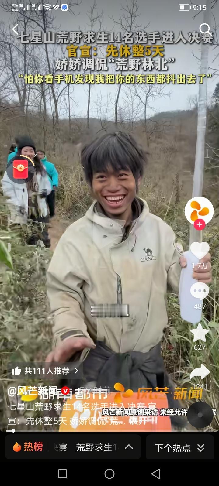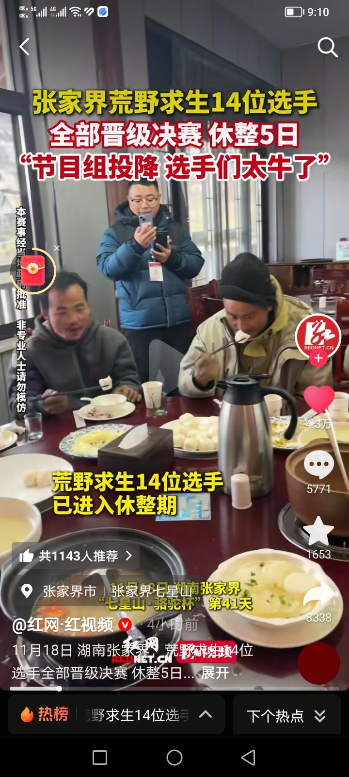 七星山荒野求生比赛14名选手已经全部进入决赛,选手今天已经下山到休息区了,他们体内长时间缺油水和盐,所以节目组补充的是比较清淡的营养餐。有包子,竹笋汤。休整时间从明天开始算,为期五天。每人居住是独栋别墅,不可以下山,如果下山就算是退赛了,如果缺物质,可以跟节目组说,会给你安排,如果真的要有急事要离开,要跟节目组申请,节目组会判断,会派人和选手一起去。(图片信息来源:红网红视频,风芒新闻)七星山荒野挑战 七星山生存挑战 你觉得荒野求生选手林北的心态如何 如何评价七星山荒野求生的举办 荒野七星山 野外求生档